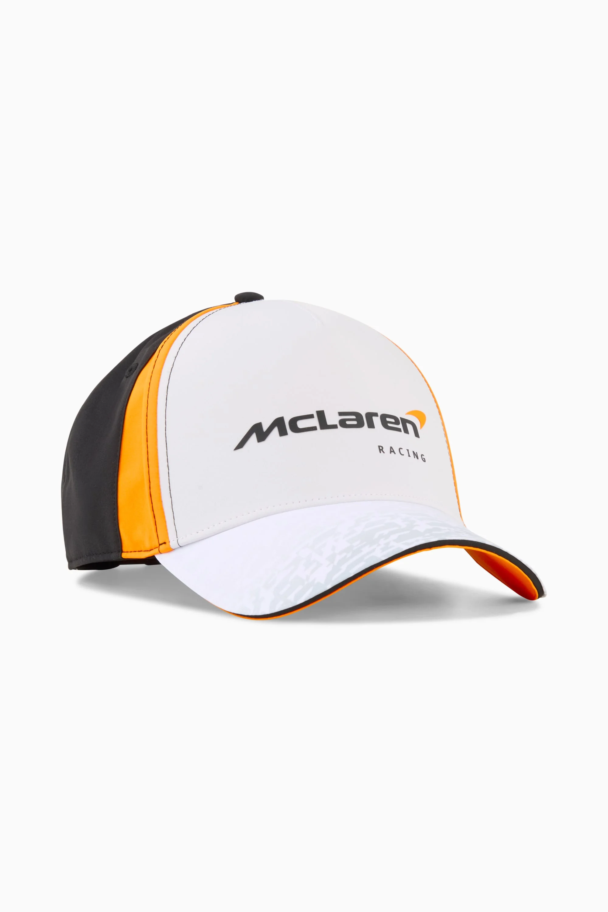 PRODUCT STORY Keep your look sharp trackside or street-side with this McLaren Racing Graphic Baseball Cap. Five-panel construction and a premium snapback closure deliver comfort and confidence. McLaren Racing details stand out, delivering race-day energy that matches your drive. FEATURES & BENEFITS - Made with at least 50% recycled materials. DETAILS - Style: 027484_01 - Color: PUMA White-Puma White - Five-panel construction - Pre-curved visor - Snapback closure - McLaren Racing graphics - PUMA branding details MATERIAL INFORMATION - Lining: 100% polyester