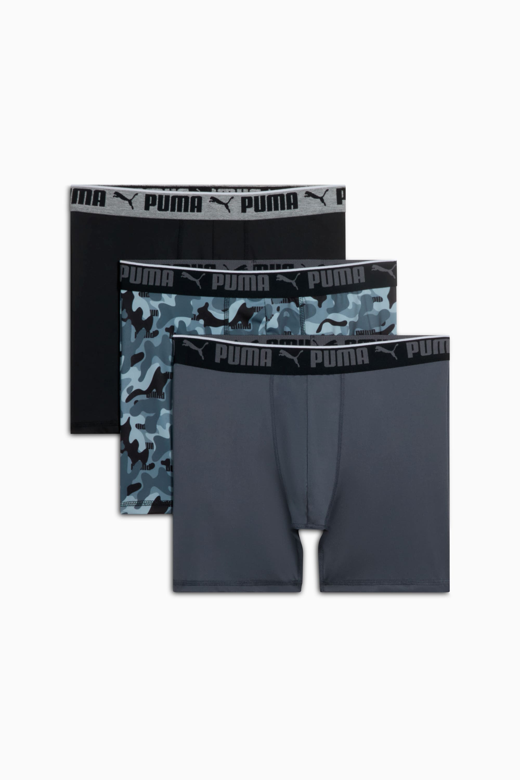 PRODUCT STORY Start your day with confidence and comfort with these essential boxer briefs, boasting a camo colorway and PUMA branding. DETAILS - Style: 942713_02 - Color: BLACK / GREY - 90% recycled polyester, 12% spandex - Pack of three - PUMA branding details