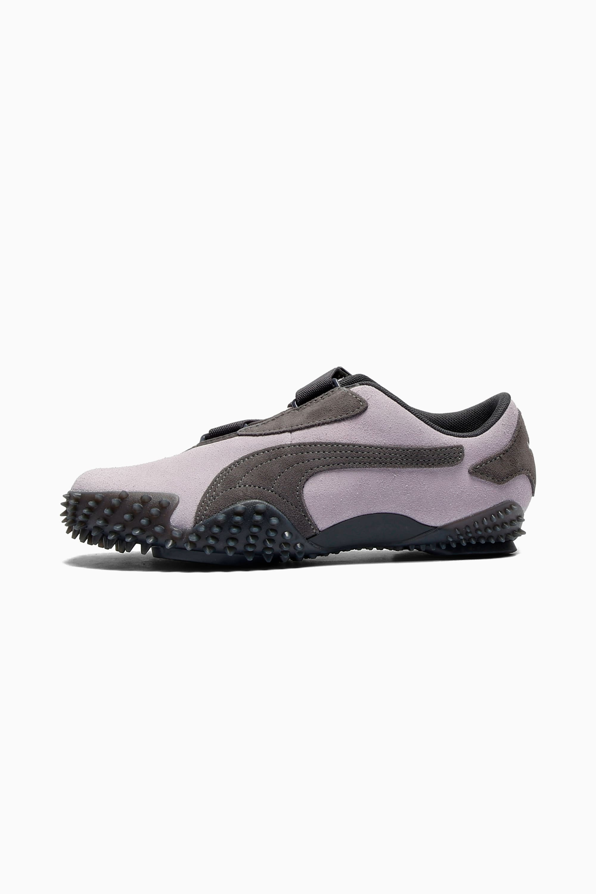 PRODUCT STORY Mostro isn't a shoe for just anyone. For over two decades, it's been worn by those who defy conventions and reject the norm. Taking its name from the Italian word for monster, Mostro is a hybrid creation that draws inspiration from two diverse realms: the sleek sprinting spikes of the '60s and the surfing shoes of the '80s. To this day, it continues to captivate with its distinctive, sculptural design, low-profile shape, and avant-garde, spiked sole. DETAILS - Style: 405410_02 - Color: Dusky Gray-Lilac Crush - Fit: Regular - Toe Type: Rounded - Fastener: Elasticated hook-and-loop closure system - Lining: Mesh - OrthoLite® sockliner - Heel Type: Flat - Midsole: Rubber - Outsole: TPU and rubber - Suede upper - Rubber spikes on the sole as design detail MATERIAL INFORMATION - Sockliner: 100% Textile - Outsole: 83.70% Rubber, 16.30% Synthetic - Upper: 87.47% Leather - cow, 10.20% Textile, 2.33% Synthetic - Lining: 100% Textile