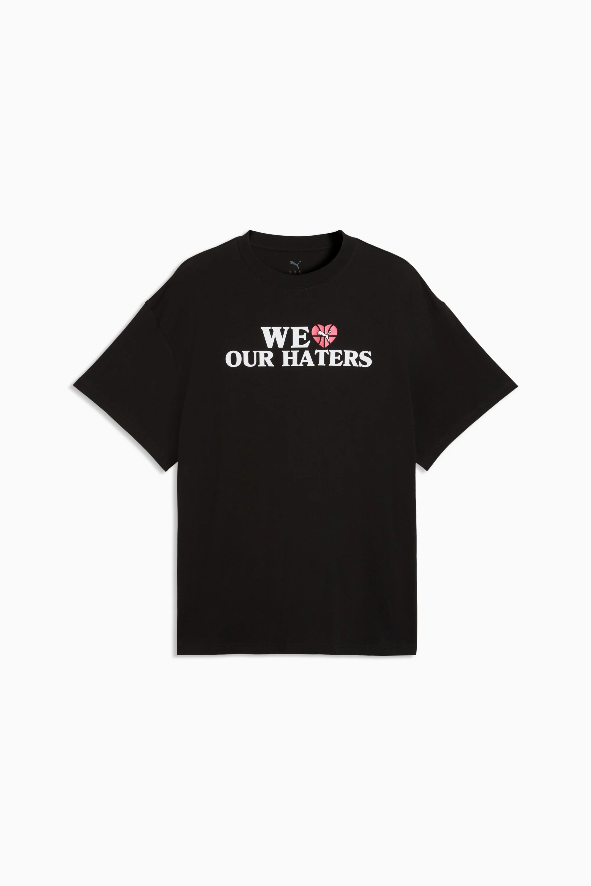 PRODUCT STORY Dedicated to the haters. This graphic t-shirt brings an edge to your basketball line-up. Wear it on the court or off. The soft feel and oversized cut help you stay comfortable in the stadium and beyond. FEATURES & BENEFITS - Made with at least 20% recycled cotton. DETAILS - Style: 634953_02 - Color: PUMA Black - Fit: Oversized - Main material type: Single jersey - Neck: Crew neck - Short sleeves - Length: Regular - Rise: Medium - Basketball graphics on the front MATERIAL INFORMATION - Shell: 100% cotton - Rib: 70% cotton, 30% polyester