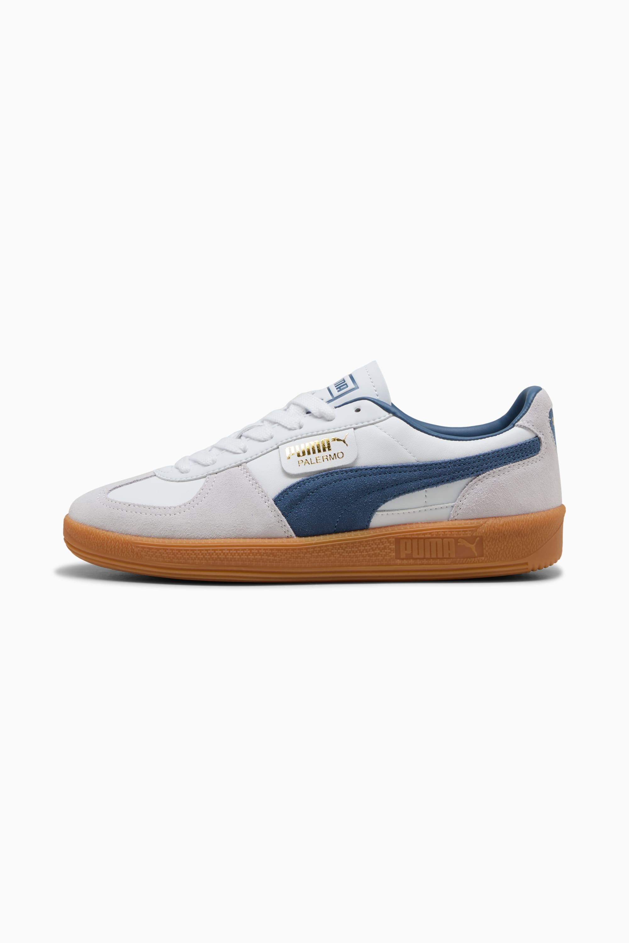 PRODUCT STORY Straight from the archives, it’s the PUMA Palermo. This classic terrace shoe is revived today with its signature T-toe construction, plus extra-bold colorblocking and plush materials. Its design builds on PUMA’s heritage within soccer, while appealing to today’s sneakerheads and terrace fashion mavens. FEATURES & BENEFITS - PUMA’s leather products support responsible manufacturing via the Leather Working Group. www.leatherworkinggroup.com DETAILS - Style: 396464_24 - Color: PUMA White-Dark Indigo - Low boot - Lace closure - PUMA branding details - Suede PUMA Formstrip - Synthetic leather tongue, eyestay and quarter panel underlay MATERIAL INFORMATION - Midsole: 100% Synthetic - Sockliner: 100% Textile - Outsole: 100% Rubber - Upper: 82.49% Leather - cow, 17.51% Synthetic - Lining: 60% Textile, 40% Synthetic
