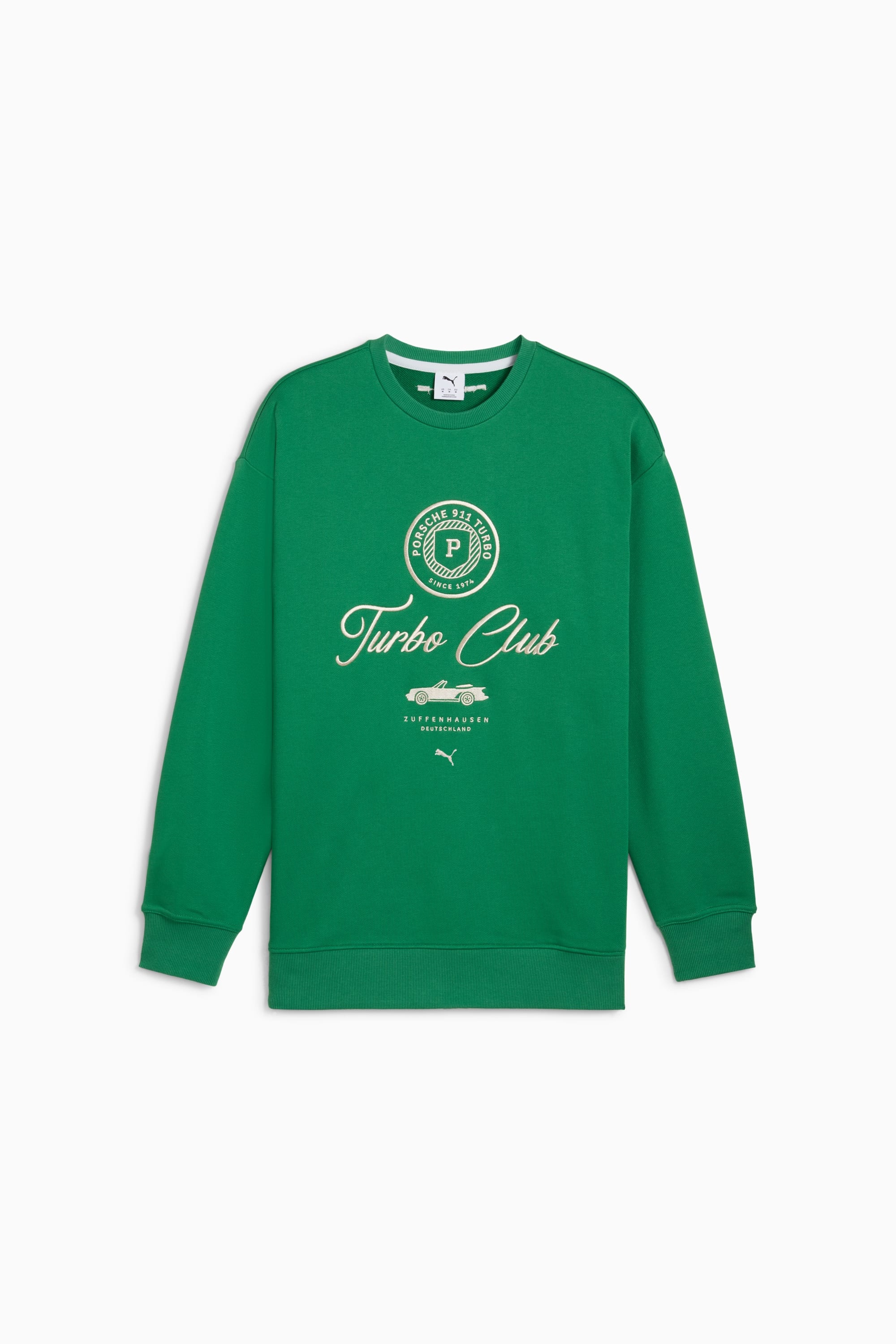 PRODUCT STORY Porsche Legacy presents Turbo Club, one of the most prestigious clubs in the world. It's country club inspired, with a special focus on the Porsche 911 Turbo to bring to life an iconic lifestyle collection. Celebrate the legacy with this relaxed-fit crew and make a statement wherever you go. DETAILS - Style: 630268_11 - Color: Archive Green - Relaxed fit - Main material: French Terry - Regular length - Crew neck - Long sleeves - Seasonal "Turbo Club" graphic embroidered on the front MATERIAL INFORMATION - Shell: 81% cotton, 19% polyester - Rib: 97% cotton, 3% elastane