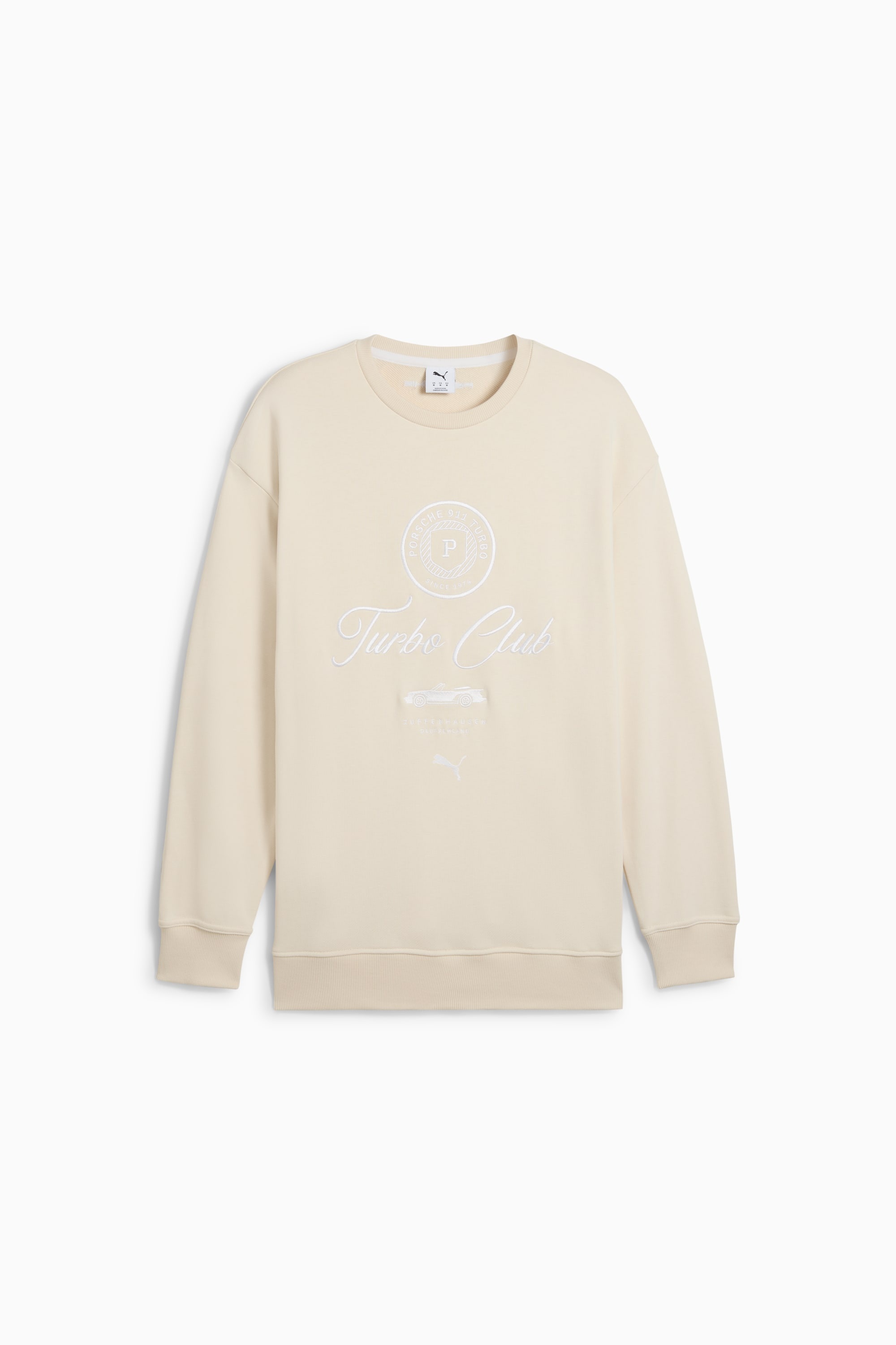 PRODUCT STORY Porsche Legacy presents Turbo Club, one of the most prestigious clubs in the world. It's country club inspired, with a special focus on the Porsche 911 Turbo to bring to life an iconic lifestyle collection. Celebrate the legacy with this relaxed-fit crew and make a statement wherever you go. DETAILS - Style: 630268_09 - Color: Alpine Snow - Relaxed fit - Main material: French Terry - Regular length - Crew neck - Long sleeves - Seasonal "Turbo Club" graphic embroidered on the front MATERIAL INFORMATION - Shell: 81% cotton, 19% polyester - Rib: 97% cotton, 3% elastane