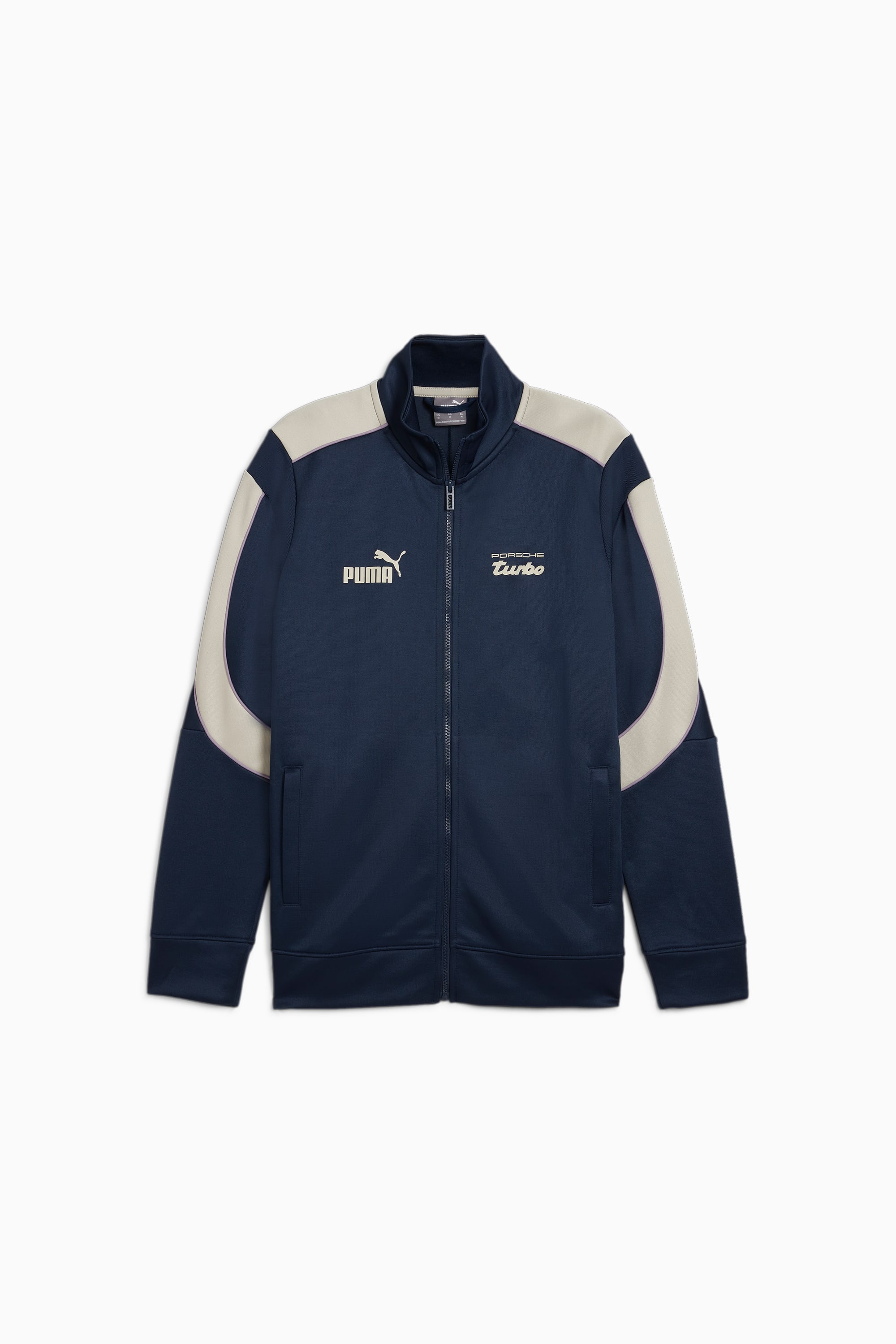 PRODUCT STORY Experience the excitement of performance driving with every step. This Porsche Legacy track jacket blends PUMA's iconic T7 design with a contemporary silhouette for a bold, streamlined look. Featuring stripes and piping, it's made for those who push limits both on and off the track. FEATURES & BENEFITS - dryCELL: Performance technology designed to wick moisture from the body and keep you free of sweat during exercise DETAILS - Style: 626372_03 - Color: Club Navy - Regular fit, regular length - 275 gsm, spacer - Stand-up collar - Full-zip closure - Long sleeves - Side pockets - Contrast MT7+ stripes and piping on the shoulders and sleeves - Porsche Turbo and PUMA logos on the chest MATERIAL INFORMATION - Upper Pocket Bag: 100% polyester - Shell: 66% polyester, 34% cotton - Lower Pocket Bag: 66% polyester, 34% cotton - Rib: 97% polyester, 3% elastane