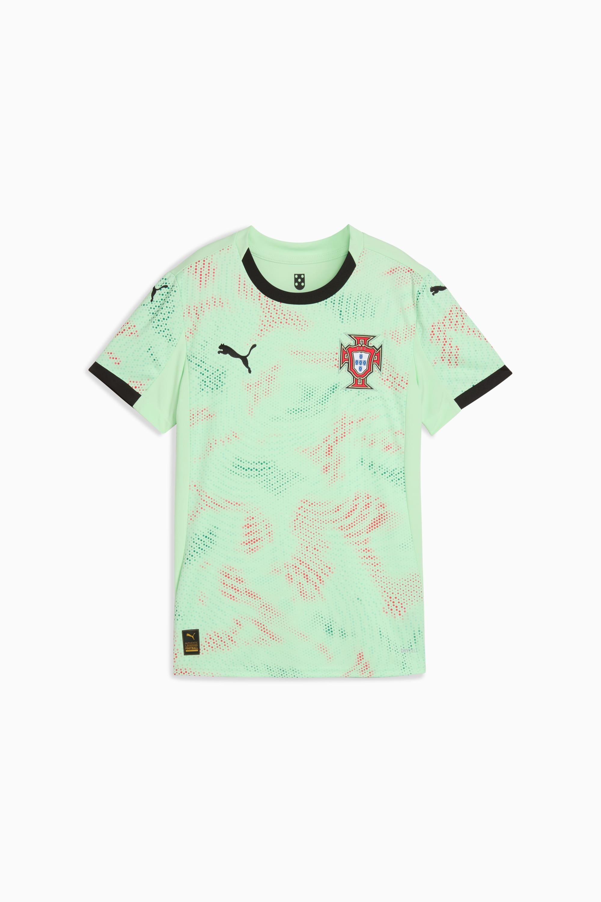 PRODUCT STORY The future shines brightly in the Women's Portugal Away Kit. Bold graphics with red and green highlights are brought to life with motion to celebrate the intersection of art, technology, and football in modern-day Portugal. Designed for the fans, Replica jersey pairs the same match-worn look with a casual silhouette, details, and materials, ideal for both game day and everyday wear. This kit is made with RE:FIBRE, PUMA’s program to transform textile waste and other used materials into new textiles. FEATURES & BENEFITS - RE:FIBRE: As part of the RE:FIBRE program, this garment is made of at least 95% recycled material from textile waste and other used materials - COMFORT: dryCELL sweat-wicking technology designed to keep you dry and comfortable DETAILS - Style: 779211_05 - Color: Fresh Mint-PUMA Black - Regular fit - Short sleeves - Crew neck - Curved side and underarm panels - Official national badge placed on left chest - PUMA Cat logo placed on right chest MATERIAL INFORMATION - SHELL: 100% polyester - RIB: 100% polyester