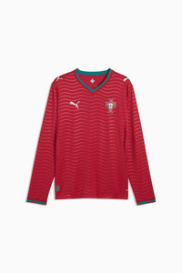 PRODUCT STORY Portugal’s Home Kit channels the energy of the ocean and the intensity of a team ready to make waves on the biggest stage. The iconic red base is layered with a wavy pattern and green accents, a nod to the country’s maritime roots and fearless spirit. It’s a design that speaks to those who were born to explore and live to play por amor a camisola. Designed for the fans, the long sleeve jersey pairs the same match-worn look with a casual silhouette, details, and materials, ideal for both game day and everyday wear. FEATURES & BENEFITS - MOISTURE MANAGEMENT: Technical dryCELL fabrics wick moisture away from the skin to help keep you dry and comfortable - As part of the RE:FIBRE program, this garment is made of at least 95% recycled material from textile waste and other used materials. DETAILS - Style: 783279_01 - Color: Club Red-Green Lagoon - Fit: Regular - Main material: Double-face jacquard - Neck: Crew neck - Long sleeves - Mesh panels for ventilation - Portugal badge - PUMA Cat logo MATERIAL INFORMATION - Inserts: 100% polyester - Shell: 100% polyester - Rib: 97% polyester, 3% elastane