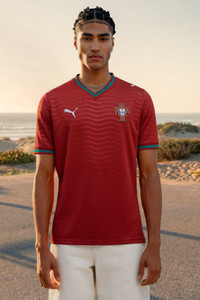 PRODUCT STORY Portugal’s Home Kit channels the energy of the ocean and the intensity of a team ready to make waves on the biggest stage. The iconic red base is layered with a wavy pattern and green accents, a nod to the country’s maritime roots and fearless spirit. It’s a design that speaks to those who were born to explore and live to play por amor a camisola. Designed for the fans, this Replica jersey pairs the same match-worn look with a casual silhouette, details, and materials, ideal for both game day and everyday wear. FEATURES & BENEFITS - COMFORT: dryCELL sweat-wicking technology designed to keep you dry and comfortable - As part of the RE:FIBRE program, this garment is made of at least 95% recycled material from textile waste and other used materials DETAILS - Style: 783278_01 - Color: Club Red-Green Lagoon - Fit: Regular - Main material: Double-face jacquard - Neck: Crew neck - Short sleeves - Mesh panels for ventilation - Portugal badge - PUMA Cat logo MATERIAL INFORMATION - Inserts: 100% polyester - Shell: 100% polyester - Rib: 97% polyester, 3% elastane