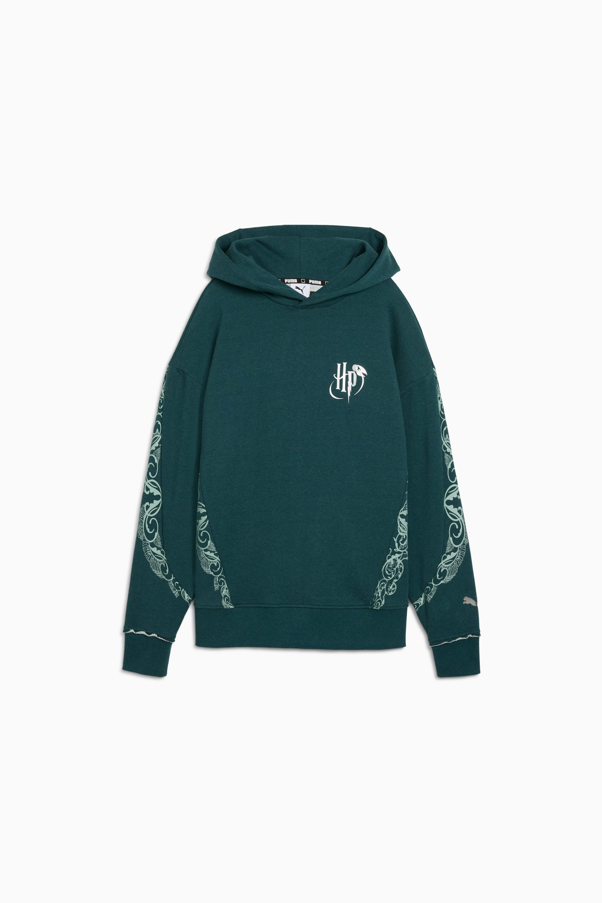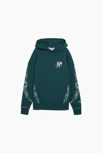 PRODUCT STORY The all-new PUMA HOOPS x HARRY POTTER™ collection is a mysterious mashup of basketball and the beloved fantasy series. Featuring a full range of apparel, footwear, and accessories, this collection is ready for anything, whether you live in the magical world or the muggle world. Apparel designs include basketball mesh shorts and comfy pre-game sweat gear, all with Harry Potter™–inspired graphics. FEATURES & BENEFITS - Made with at least 20% recycled cotton DETAILS - Style: 633108_01 - Color: Green Terrain-heather - Fit: Relaxed - Hooded - Pockets: Kangoroo pocket - Ribbed cuffs - Harry Potter™-inspired graphics MATERIAL INFORMATION - Hood Lining: 100% cotton - Shell: 100% cotton - Rib: 97% cotton, 3% elastane