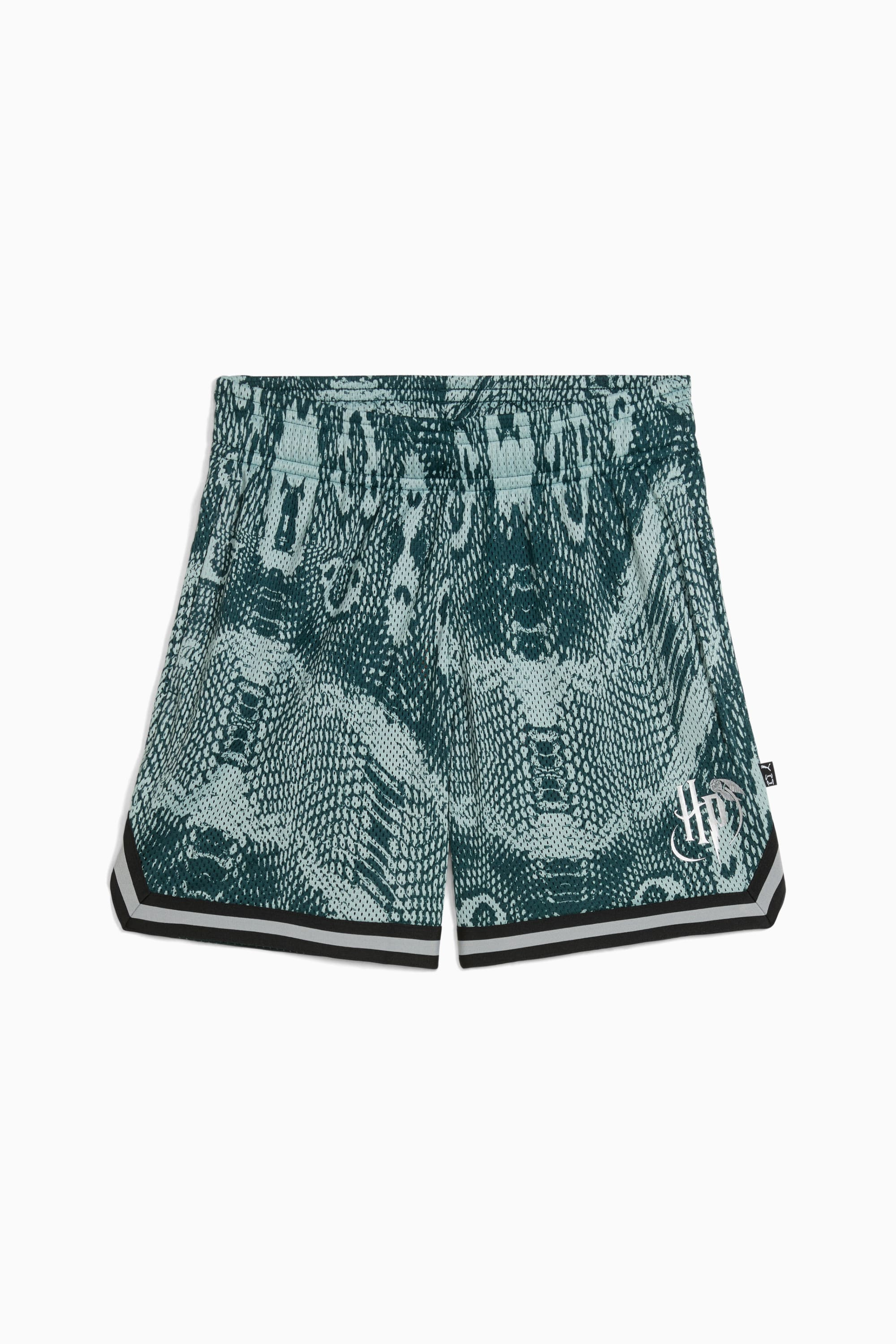 PRODUCT STORY The all-new PUMA HOOPS x HARRY POTTER™ collection is a mysterious mashup of basketball and the beloved fantasy series. Featuring a full range of apparel, footwear, and accessories, this collection is ready for anything, whether you live in the magical world or the muggle world. Apparel designs include basketball mesh shorts and comfy pre-game sweat gear, all with Harry Potter™–inspired graphics. FEATURES & BENEFITS - Made with 100% recycled material excluding trims & decorations DETAILS - Style: 633114_01 - Color: Green Terrain-AOP - Fit: Relaxed - Length: Above knee length - Bottom: Open bottom - Rise: Medium - HARRY POTTER™ branding - PUMA branding details MATERIAL INFORMATION - Upper Pocket Bag: 100% polyester - Lining: 100% polyester - Shell: 100% polyester - Pocket Bag: 100% polyester