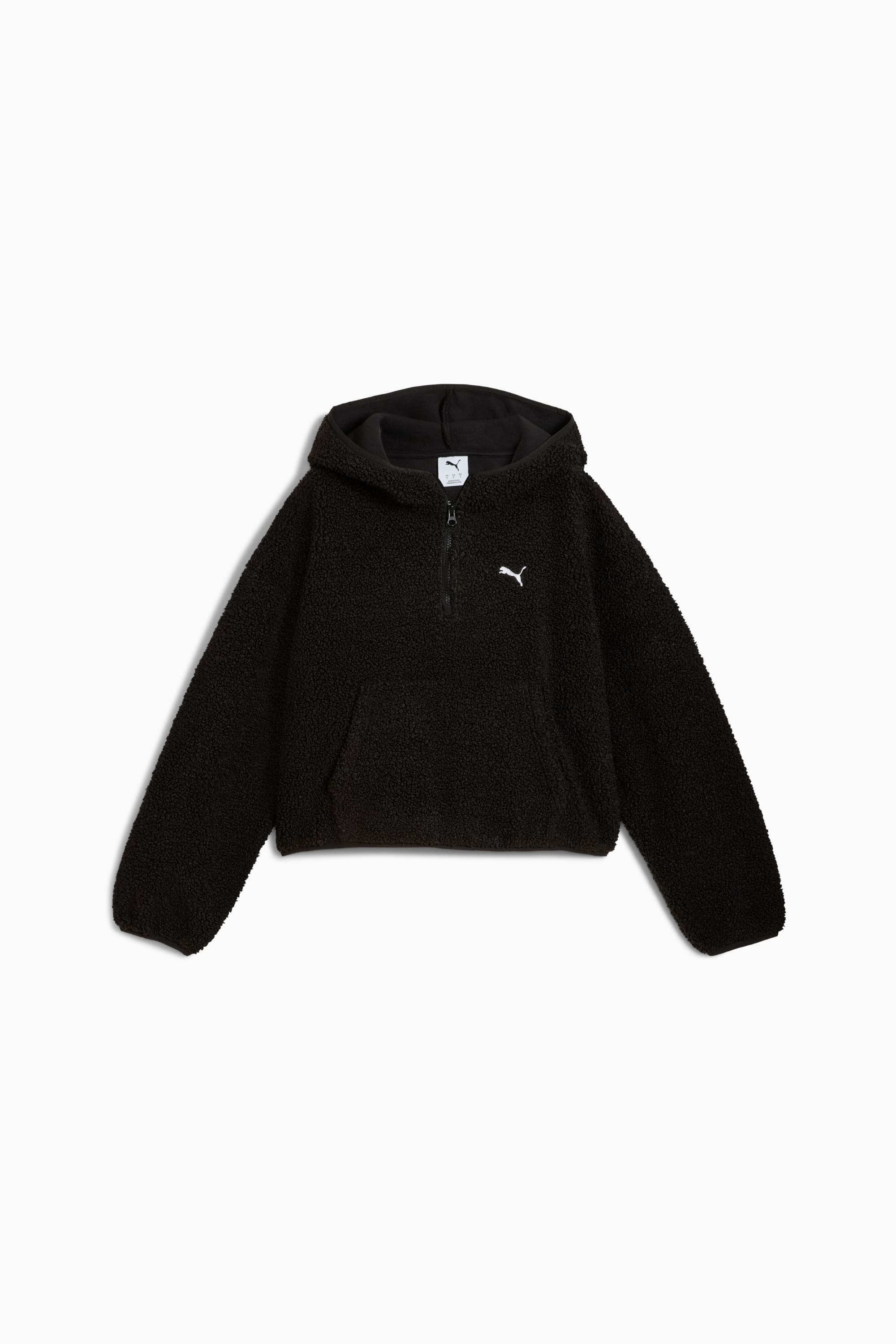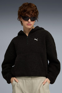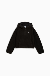 PRODUCT STORY Make mornings easy with PUMA's Wardrobe Essentials. These are your go-to pieces for busy days. Combining retro vibes with a modern edge, these versatile styles will keep you comfortable and looking great, no matter where your day takes you. FEATURES & BENEFITS - Made with at least 90% recycled materials. DETAILS - Style: 632048_01 - Color: PUMA Black - Fit: Oversized - Main material: Polar fleece - Long sleeves - Fastener: Half zip - Length: Regular - Elastic binding on hood, cuffs and hem for a snug fit MATERIAL INFORMATION - Shell: 100% polyester