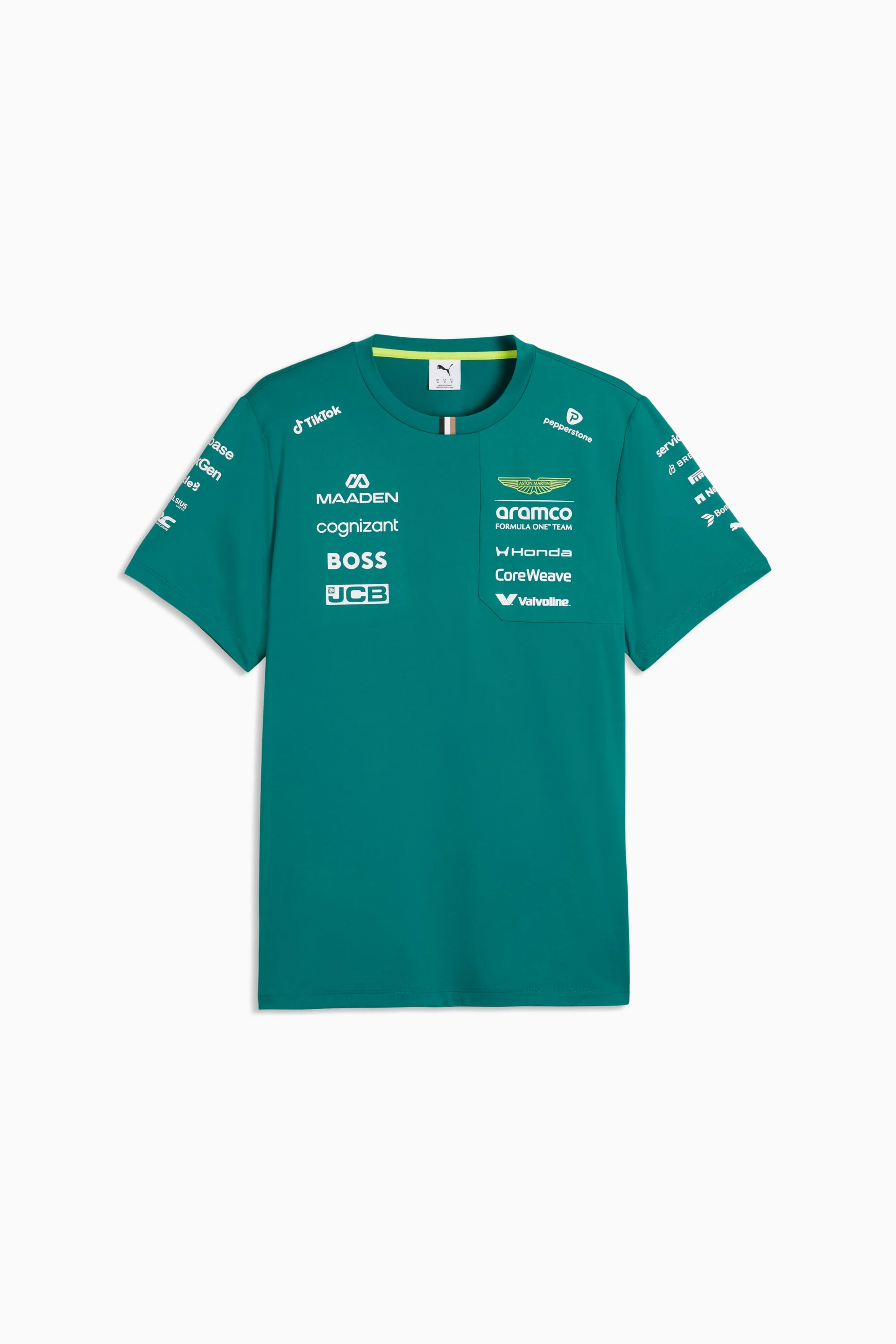 PRODUCT STORY Why just watch the race when you can be part of it? The PUMA x ASTON MARTIN ARAMCO F1® TEAM Replica Collection combines the iconic Aston Martin Green with lime accents, bringing race day energy to your every day. This is the official 2026 Team Replica Tee, as seen worn throughout the racing season. Because behind every lap is a team – and now, you’re part of it. FEATURES & BENEFITS - Made with at least 50% recycled materials DETAILS - Style: 713889_01 - Color: Green Lux - Fit: Regular - Main material type: Single jersey - Neck: Crew neck - Short sleeves - Length: Regular - PUMA x ASTON MARTIN ARAMCO F1® TEAM details - PUMA branding details MATERIAL INFORMATION - Shell: 94% polyester, 6% elastane - Overlay: 92% nylon, 8% elastane