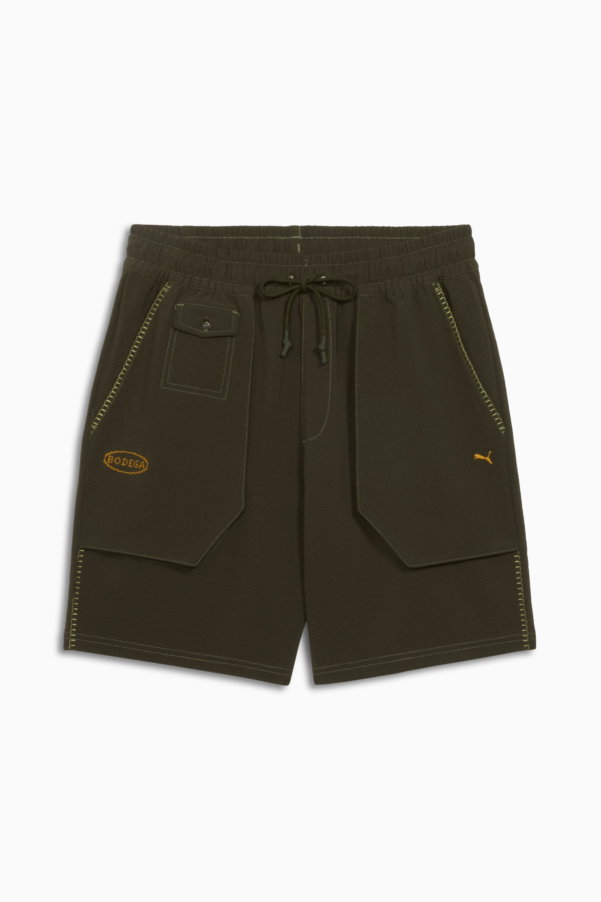 PRODUCT STORY Own your style with bold blanket stitch details and cross-stitched PUMA x BODEGA branding. The elastic waistband with rubber-dipped drawcord provides a custom fit, while the above-knee cut keeps it effortlessly casual. Perfect for relaxed days or creative streetwear vibes, PUMA brings style with an edge. FEATURES & BENEFITS - Made with at least 90% recycled materials. DETAILS - Style: 633484_70 - Color: Dark Olive - Fit: Relaxed - Length: Above Knee length - Rise: Medium - Pockets: Back Pocket, Front Pocket MATERIAL INFORMATION - Shell: 97% polyester, 3% elastane