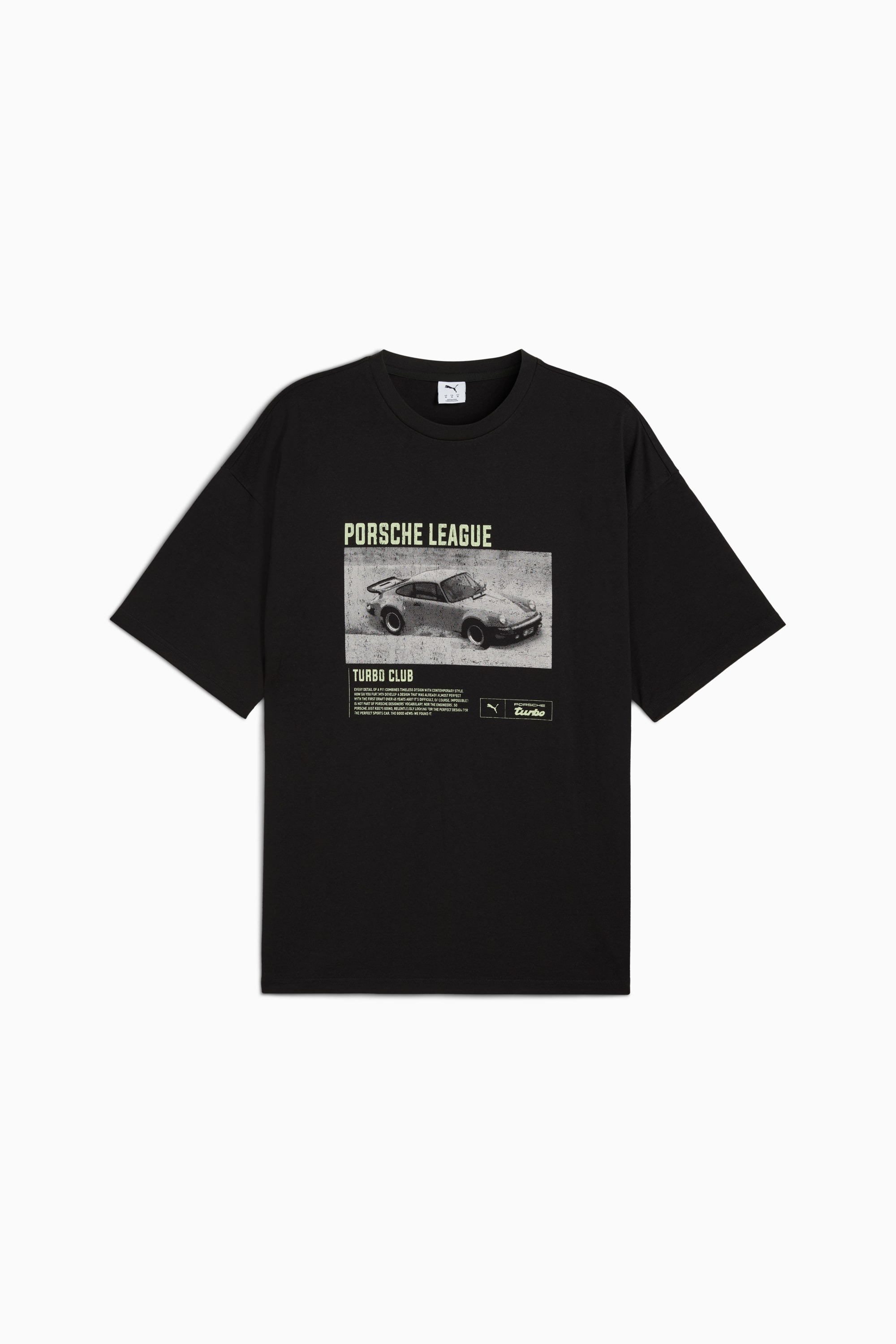PRODUCT STORY For those who move with effortless confidence, the newest PUMA x PORSCHE LEGACY drop merges vintage sport aesthetics with a modern streetwear edge. Relaxed silhouettes, sun-faded neutrals, and worn-in textures create a laid-back, well-loved feel. Graphic tees, oversized outerwear, and washed leather offer a rugged yet refined look, perfect for effortless summer days and nights that never stop. FEATURES & BENEFITS - Made with at least 20% recycled cotton. DETAILS - Style: 632691_01 - Color: PUMA Black - Oversized fit - Main material type: Single jersey - Short sleeves - Crew neck - Regular length - Porsche League Turbo Club graphic on the front MATERIAL INFORMATION - Shell: 100% cotton - Rib: 71% cotton, 29% polyester