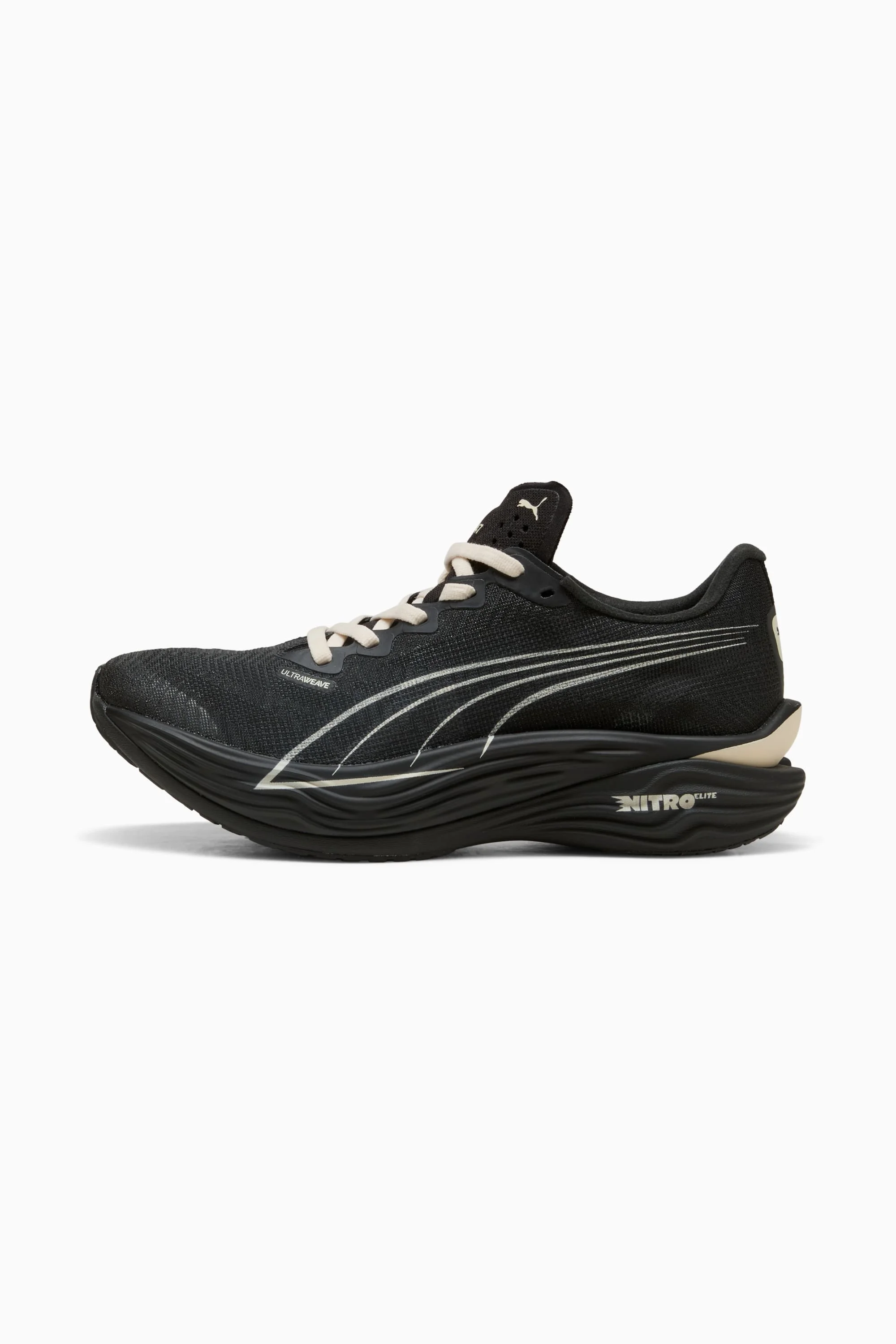 PRODUCT STORY Luxury streetwear meets elite engineering in the PUMA x REPRESENT Deviate Elite 3. This high-performance silhouette is reimagined through the 247 by Represent aesthetic, blending function and style for any setting. Powered by best-in-class NITROFOAM™ ELITE cushioning, it’s finished with custom 247 by Represent details, premium materials, and a stealth black colorway. A high-speed icon, elevated for every dimension of your day. FEATURES & BENEFITS - NITROFOAM™ ELITE: Innovative nitrogen-infused foam technology that uses the most cutting-edge materials for lightweight responsiveness and performance on race day - PWRPLATE: Full-length carbon fiber plate for powerful propulsion and elite efficiency - ULTRAWEAVE: Premium lightweight material engineered for breathability - PUMAGRIP: Outsole is made of durable rubber compound for multi-surface traction DETAILS - Style: 408494_01 - Color: PUMA Black-Alpine Snow - Fit: Regular - Toe Type: Rounded - Fastener: Laces - Heel Type: Flat - Cushioning: Max - Heel-to-toe drop: 8 mm - Stack height: 40mm/32mm MATERIAL INFORMATION - Midsole: 100% Synthetic - Sockliner: 100% Textile - Outsole: 87% Rubber, 13% Synthetic - Upper: 82% Textile, 18% Synthetic - Lining: 100% Textile