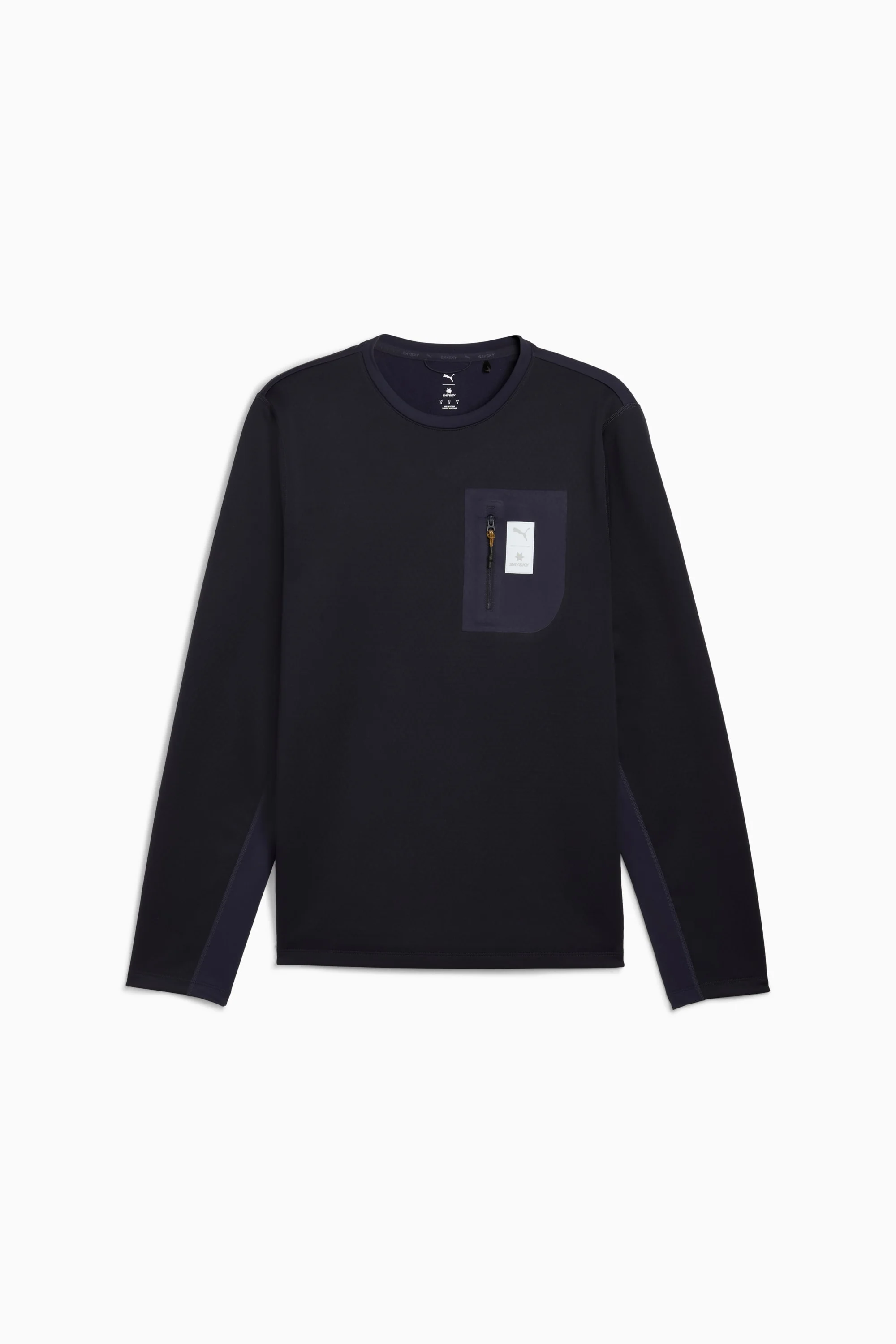 PRODUCT STORY Race day is about more than just the run – it’s a celebration of community, culture, and shared energy. Whether you’re chasing a PR or cheering from the sidelines, the latest PUMA x SAYSKY collection captures the spirit of the sport. Rooted in unity, the collection’s bold, sharp silhouettes capture the discipline and power of the pack - designed to make runners feel unstoppable, together. Collection pieces blend SAYSKY’s bold design language with PUMA’s cutting-edge running technology. The capsule also includes travel-ready essentials made for getting to and from the course. From race to recovery, it’s everything you need to tackle a race weekend in style. FEATURES & BENEFITS - Made with at least 90% recycled materials - PREMIUM COMFORT + FIT: Super-soft CLOUDSPUN fabrics pair performance design with 4-way stretch for enhanced movement and comfort - MOISTURE MANAGEMENT: Technical dryCELL fabrics wick moisture away from the skin to help keep you dry and comfortable - REFLECTIVE design details DETAILS - Style: 527553_16 - Color: New Navy - Regular fit - Long sleeves - Regular length - Fastener: Quarter zip - Zip pocket on the chest - PUMA x SAYSKY co-branding details