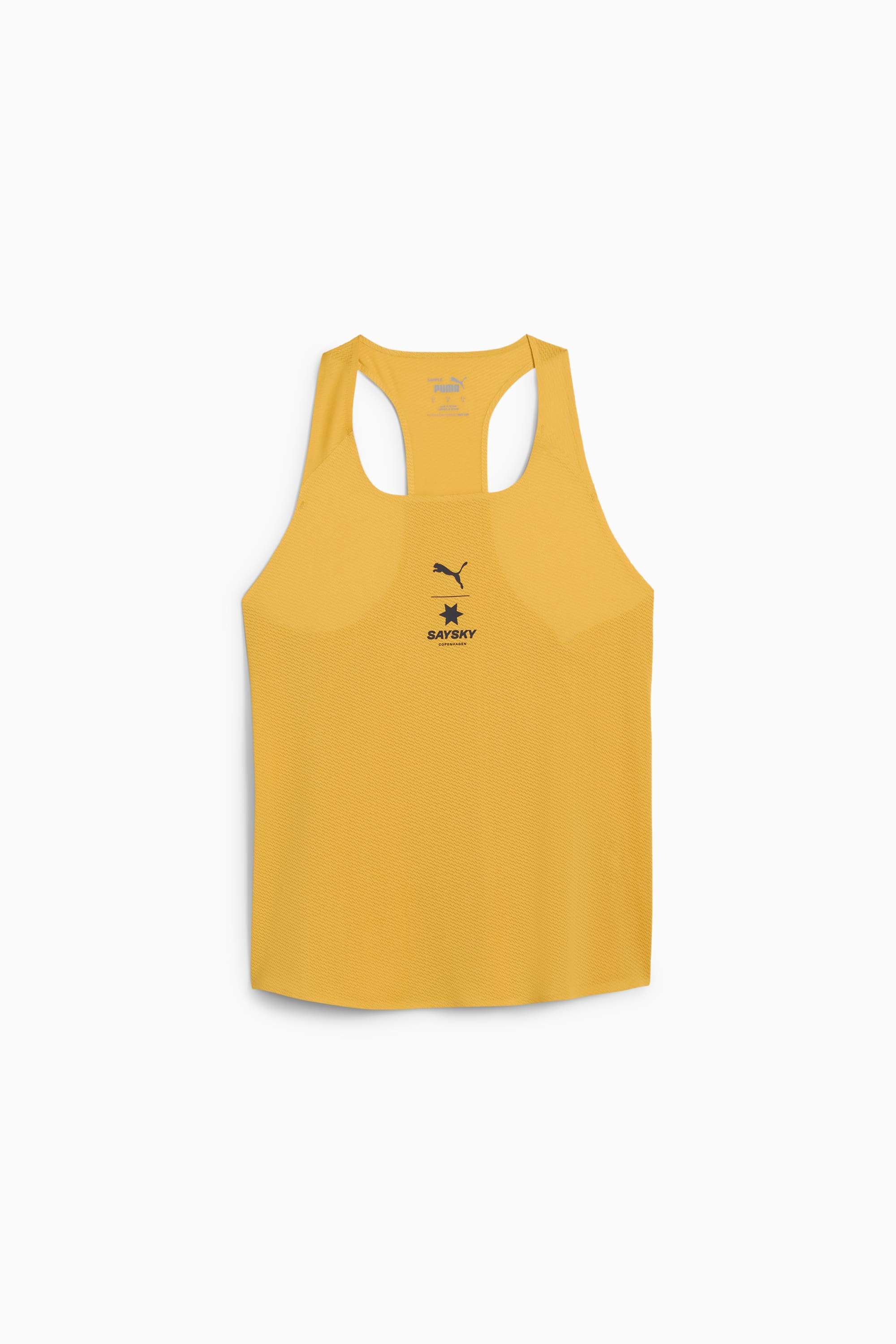 PRODUCT STORY Run like never before with our latest singlet, crafted with ULTRASPUN technology for elite performance. Featuring THERMOADAPT for cooling, bonded armholes for reduced friction, and perforated ventilation for ultimate breathability. Feel unstoppable with PUMA's cutting-edge design. FEATURES & BENEFITS - Made with 100% recycled material excluding trims & decorations - dryCELL: Performance technology designed to wick moisture from the body and keep you free of sweat during exercise - Thermoadapt: HeiQ smart temp is a thermos regulation technology that provides fabrics with the ability to dynamically respond to body heat - ULTRASPUN: Running technology built for the elite runner. Lightest in class, moisture wicking and anti-chafing properties. Perforated ventilation for ultimate breathability. DETAILS - Style: 526838_62 - Color: Archive Gold - Regular fit - Single face jacquard fabric - Regular length - Crew neck - Sleeveless - PUMA x SAYSKY branding details MATERIAL INFORMATION - SHELL: 100% polyester