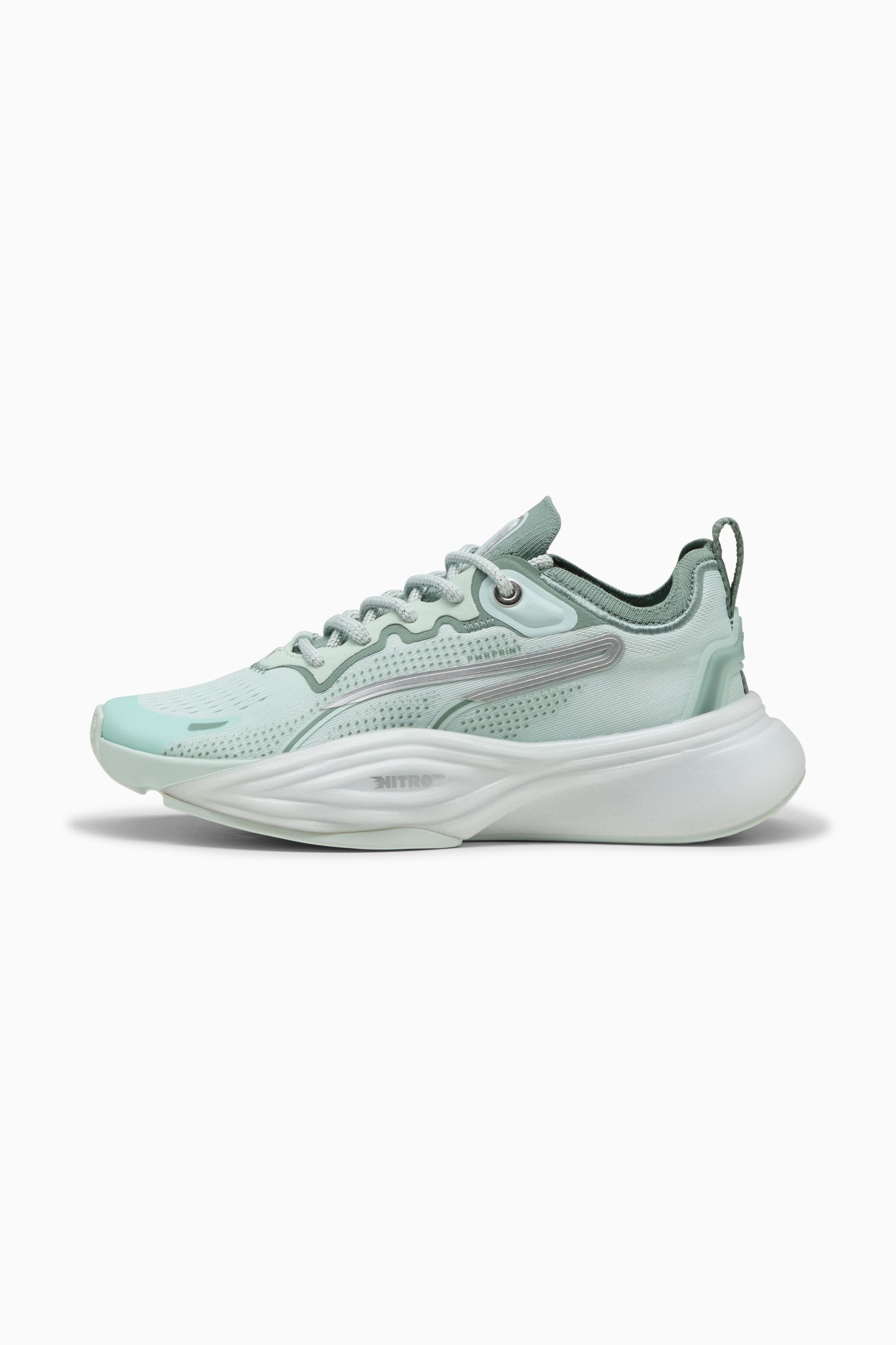 PRODUCT STORY Step up your game with PUMA's latest. Featuring NITROFOAM™ for explosive energy, PUMAGRIP for unbeatable traction, and a TPU Heel Support Clip for added stability. The engineered mesh upper and Ortholite® cushioning ensure every move feels unstoppable. FEATURES & BENEFITS - The upper of the shoes is made with at least 30% recycled materials - NITROFOAM™: Advanced nitrogen-injected foam designed to provide superior responsiveness and cushioning in a lightweight package - PUMAGRIP: Durable performance rubber compound designed for all-surface traction DETAILS - Style: 311090_01 - Color: Peaceful Blue-Green Moon - Regular width - Textile upper - Lace closure - Heel-to-toe drop: 8mm - Recommended for: neutral pronators - PUMA branding details MATERIAL INFORMATION - Midsole: 100% Synthetic - Sockliner: 100% Textile - Outsole: 100% Rubber - Upper: 79% Textile, 21% Synthetic - Lining: 100% Textile