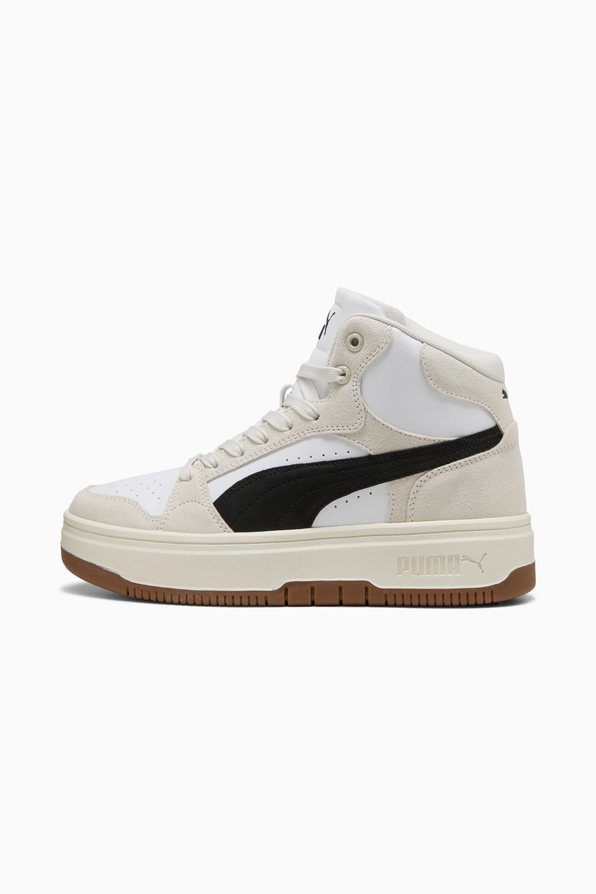PRODUCT STORY Drawing inspiration from basketball sneakers of the '80s, these PUMA kicks take comfort and style to the next level. Available in a range of versatile designs, whether you choose high-top, mid-, or low-cut, these sneakers are PUMA classics that you'll want in your wardrobe forever. FEATURES & BENEFITS - SOFTFOAM+: Step-in comfort sockliner designed to provide soft cushioning thanks to its extra thick heel DETAILS - Style: 402595_01 - Color: PUMA White-PUMA Black-Frosted Ivory - Width: Regular - Toe Type: Rounded - Fastener: Laces - Synthetic upper - Heel type: Platform - Lining: Textile - Outsole: Rubber MATERIAL INFORMATION - Outsole: 100% Rubber - Upper: 51.02% Leather - cow, 44.50% Synthetic, 4.48% Textile - Lining: 100% Textile