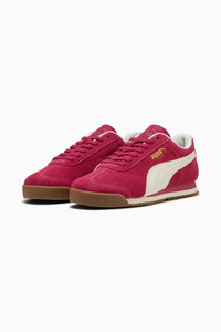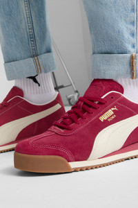 PRODUCT STORY We're bringing back an icon. Born in 1968, the PUMA Roma was originally created to celebrate the Italian Euro Cup win – and become a sport-turned-street sensation overnight. Today, over 50 years later, the Roma is back with its signature sleek look and gum rubber sole. This version features a suede upper with suede overlays, a thick padded tongue, and orthopaedic arch supports. FEATURES & BENEFITS - PUMA's leather products support responsible manufacturing via the Leather Working Group: www.leatherworkinggroup.com - ProFoam: Lightweight EVA designed to cushion your landing and propel your next step DETAILS - Style: 398635_08 - Color: Port-Warm White-Gum - Regular fit - Suede upper - Suede and synthetic overlays - Mesh lining - Lace closure - EVA midsole - Suede PUMA Formstrip with tumbled finish - PUMA branding details