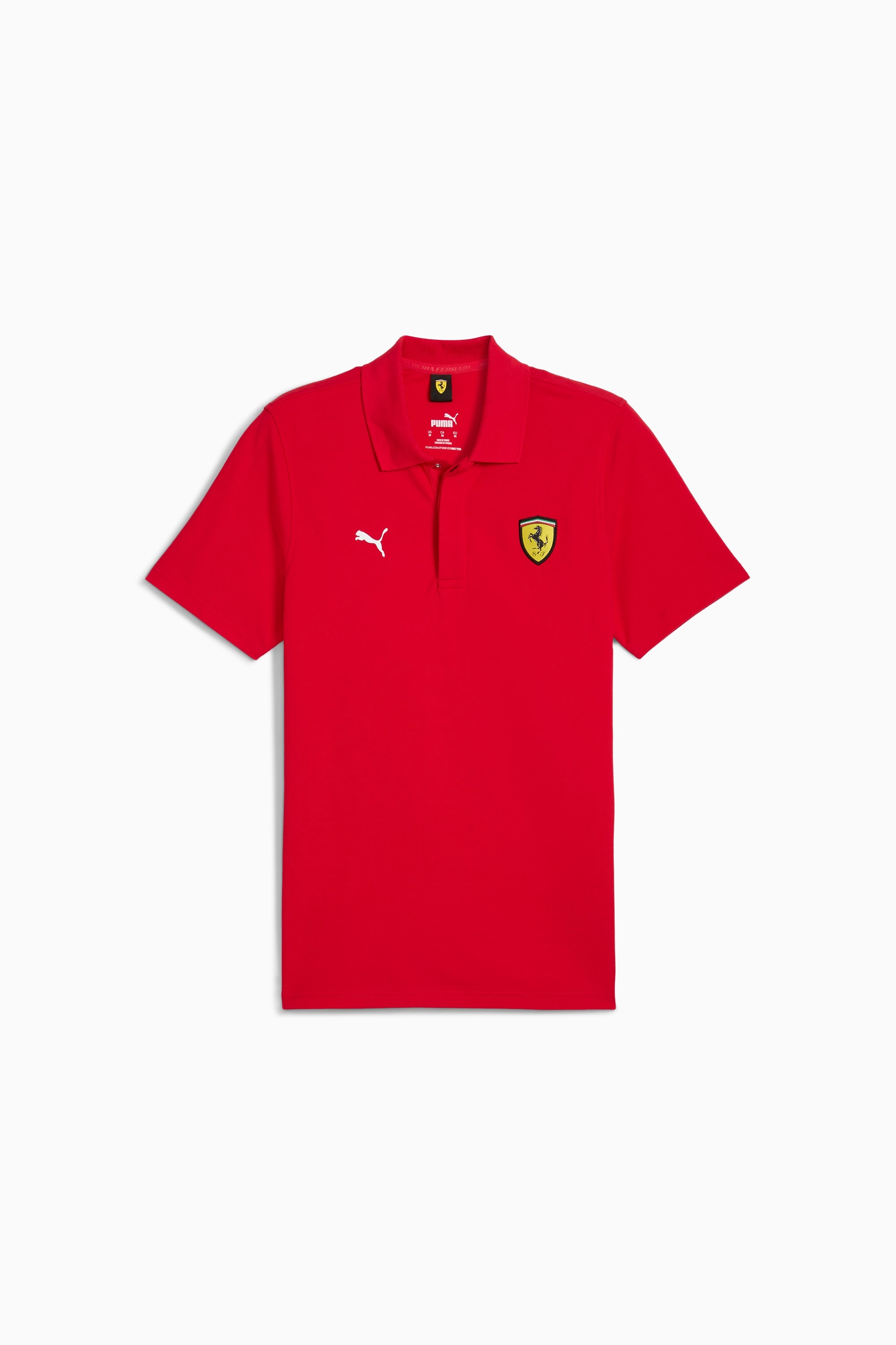 PRODUCT STORY Accelerate your winter style and stand out from the crowd in this stylish Scuderia Ferrari polo. Its lightweight, breathable design keeps you cool while the vibrant branding displays your passion for the Prancing Horse. FEATURES & BENEFITS - Made with at least 20% recycled cotton DETAILS - Style: 627053_02 - Color: Rosso Corsa - Regular fit, regular length - 200 gsm, pique - Polo collar with button placket - Short sleeves - PUMA Cat and Scuderia Ferrari shield on chest MATERIAL INFORMATION - SHELL: 100% cotton - COLLAR: 100% cotton