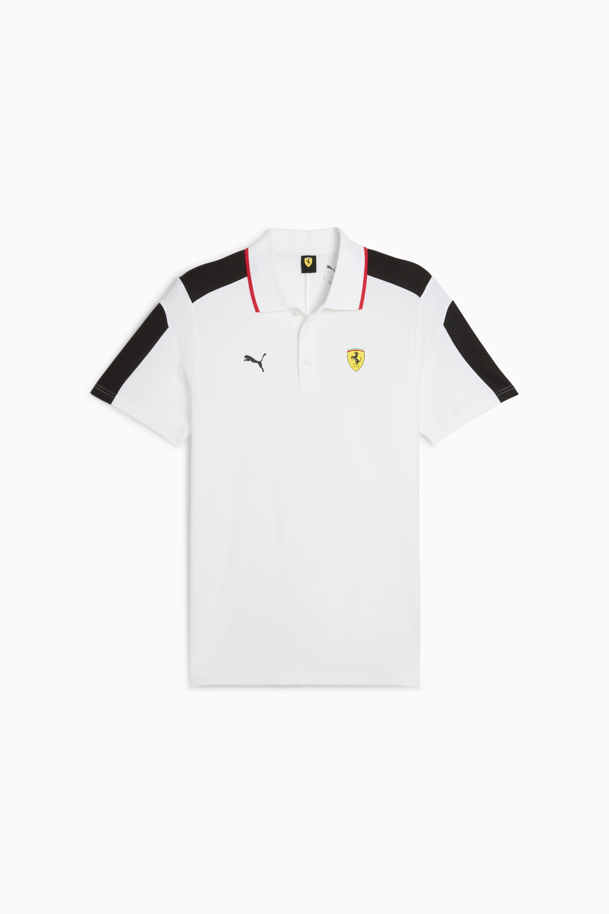 PRODUCT STORY Unleash your inner racer with the Scuderia Ferrari Race MT7 polo. Featuring color contrast panels, a regular fit, and the iconic Scuderia Ferrari and PUMA Cat logos, this polo blends tradition with innovation for a look that's pure adrenaline. FEATURES & BENEFITS - Made with at least 30% recycled materials DETAILS - Style: 630197_04 - Color: PUMA White - Regular fit - Main material: Pique material - Regular length - Short sleeves - Half placket - PUMA branding details MATERIAL INFORMATION - SHELL: 52% cotton, 48% polyester - RIB: 100% cotton