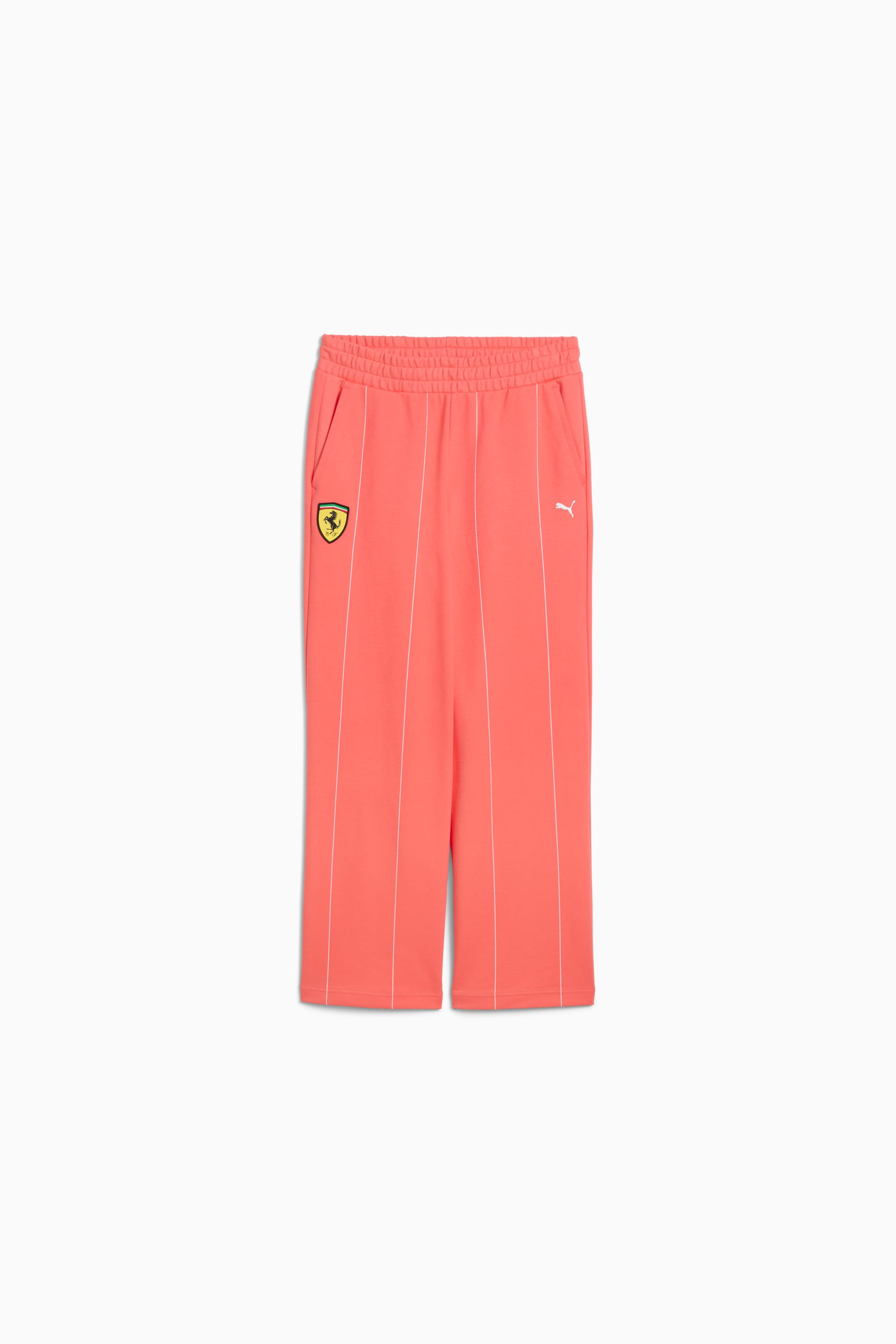 PRODUCT STORY Scuderia Ferrari fans, it's time to unite with our new collection and with these comfortable track pants. They feature an elastic waistband and a sleek jacquard pinstripe fabric for both maximum comfort and style. Adorned with iconic PUMA and Scuderia Ferrari logos, they perfectly blend tradition and innovation for a timeless look. FEATURES & BENEFITS - Made with at least 20% recycled materials DETAILS - Style: 630201_07 - Color: Peach Frost - Comfort fit - Main material: Spacer - Regular length - High rise - Welt pockets - Jacquard pinstripe fabric - Elastic waistband - Scuderia Ferrari logo on the right leg - PUMA Cat logo on the left leg MATERIAL INFORMATION - Upper Pocket Bag: 100% polyester - Shell: 75% cotton, 25% polyester - Lower Pocket Bag: 75% cotton, 25% polyester