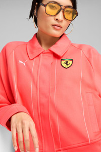 PRODUCT STORY Featuring a regular fit with zipper and snap-buttons, this PUMA jacket blends tradition with innovation. The jacquard pinstriped fabric, and elasticated hem and cuffs add a sleek touch. Show your pride with the Scuderia Ferrari and PUMA Cat logo on the chest. FEATURES & BENEFITS - Made with at least 20% recycled materials DETAILS - Style: 630199_07 - Color: Peach Frost - Regular fit - Main material: Spacer - Cropped length - Hood - Long sleeves - Kangaroo pocket - Jacquard pinstriped fabric - PUMA Cat logo on the right chest - Scuderia Ferrari logo on the left chest MATERIAL INFORMATION - Upper Pocket Bag: 100% polyester - Shell: 75% cotton, 25% polyester - Lower Pocket Bag: 75% cotton, 25% polyester