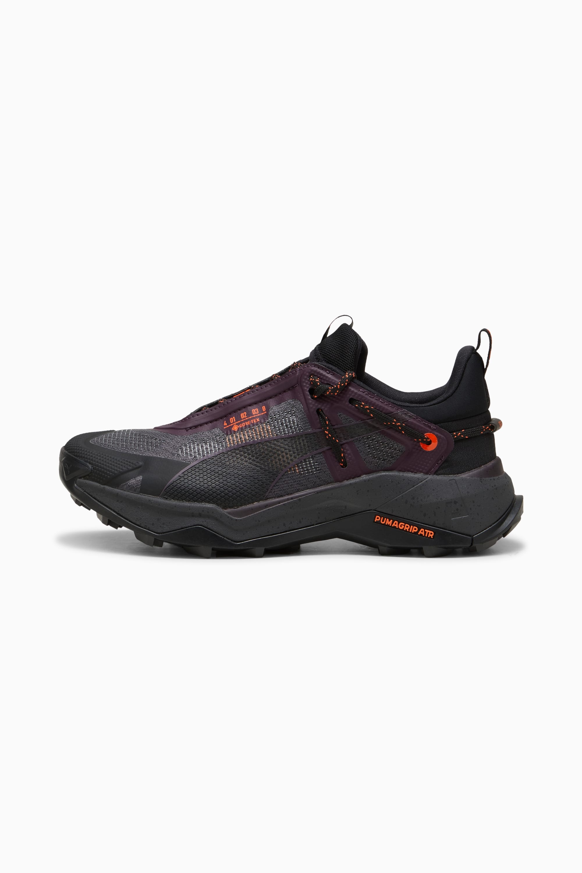 PRODUCT STORY Introducing our first hiking-specific shoe: the Explore NITRO™ GORE-TEX. It's designed for all trails, from flat and gravelly to steep and rocky, with a combination of NITROFOAM™ and PROFOAMLITE through the midsole maximizing comfort over any terrain. Throw in a PUMAGRIP ATR outsole and a unique collar shape – complete with integrated, heel supporting lacing system – and you have your next trail companion. This pair also has a waterproof GORE-TEX upper to keep you exploring the trails in all conditions. FEATURES & BENEFITS - NITRO™: Advanced nitrogen-injected foam designed to provide superior responsiveness and cushioning in a lightweight package - PROFOAMLITE: Extremely lightweight EVA designed to cushion your landing and propel each step - PUMAGRIP ATR: Trail-ready performance rubber compound designed for traction on ice, mud, and unstable surfaces - FOREVER BETTER: The upper of this shoe is made with at least 50% recycled materials as a step toward a better future DETAILS - Style: 378024_05 - Color: PUMA Black-Midnight Plum-Flame Flicker - Booty construction - GORE-TEX upper - Flared midfoot shape - Toe drainage port - Cushioning level: Max - Heel-to-toe drop: 6mm - Best for: Neutral pronators MATERIAL INFORMATION - Sockliner: 100% Textile - Outsole: 100% Rubber - Upper: 50.75% Synthetic, 49.25% Textile - Lining: 100% Textile