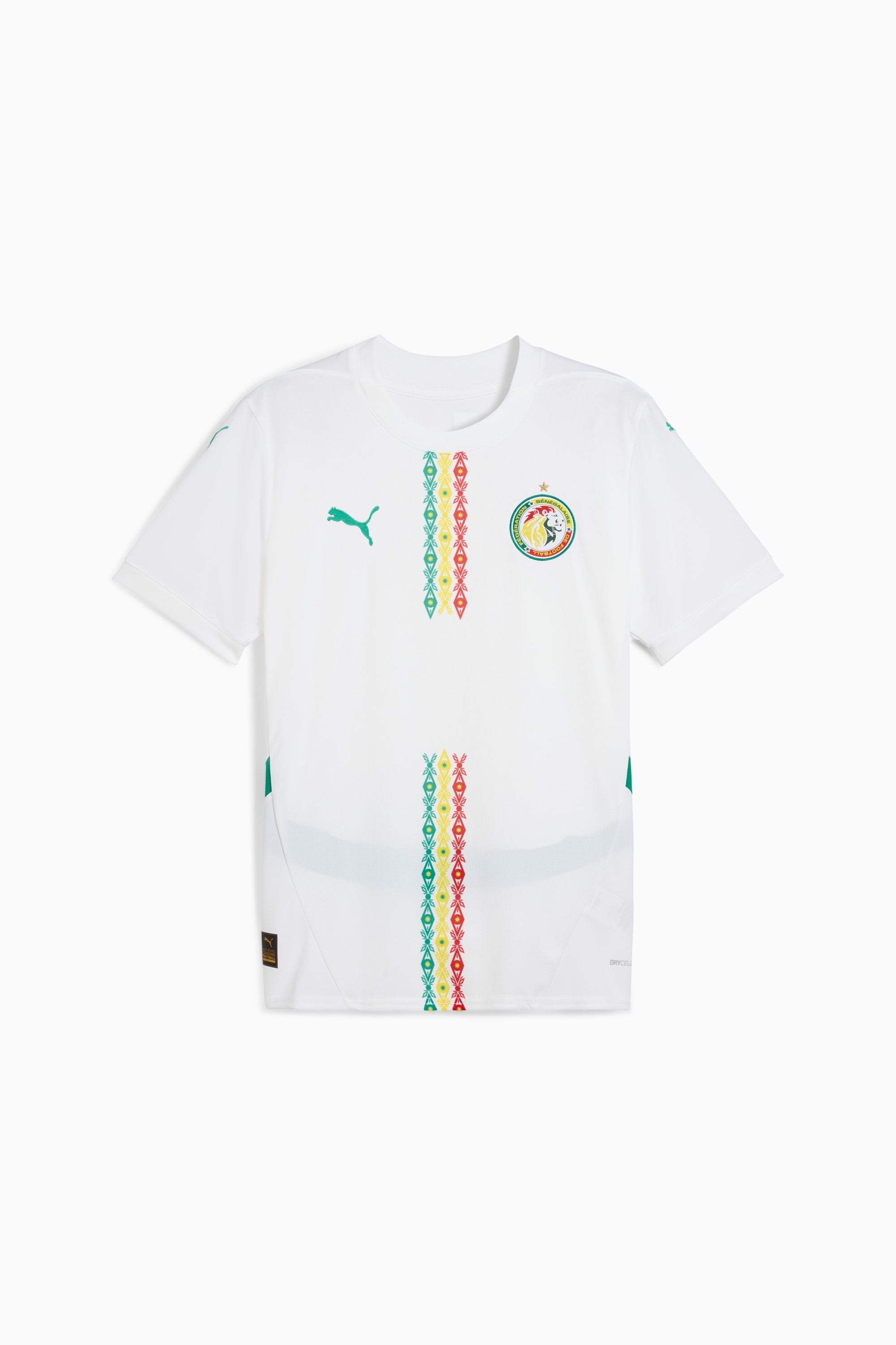 PRODUCT STORY A home kit that makes you feel at home. Take Teranga to the pitch with the Senegal Home Kit. Hospitality, generosity, and kindness – values at the heart of Senegalese culture – inspire a design that features a clean white base and accents in the colors of the national flag. FEATURES & BENEFITS - As part of the RE:FIBRE program, this garment is made of at least 95% recycled material from textile waste and other used materials DETAILS - Style: 777161_01 - Color: PUMA White-Sport Green - Regular fit - Jacquard fabric on front, back panel and sleeves for a premium feel - Short sleeves - PUMA Cat logo placed on right of chest, adding iconic style - Mesh curved side panels enhance breathability during intense matches - Senegal badge placed on left of chest for authentic team pride - PUMA branding details MATERIAL INFORMATION - Shell: 100% polyester - Rib: 100% polyester