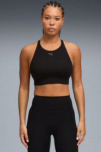 PRODUCT STORY Own your workout with high-neck coverage and medium-impact support. Made with SHAPELUXE for a smooth, form-fitting feel and LYCRA® ADAPTIV fiber for unrestricted movement. Removable pads and dryCELL technology keep you comfortable and dry, from studio sessions to daily errands. FEATURES & BENEFITS - dryCELL: Performance technology designed to wick moisture from the body and keep you free of sweat during exercise - LYCRA® ADAPTIV: Fibre in an innovative, engineered seamless construction delivers on fit and shape retention while providing form-fitting compression that moves with you - Made with at least 50% recycled materials. DETAILS - Style: 528138_01 - Color: PUMA Black - Fit: Tight - Main material: Interlock - High neck - Removable pads - Support: recommended for mid-impact workouts. MATERIAL INFORMATION - Lining: 94% polyester, 6% elastane - Shell: 82% nylon, 18% elastane