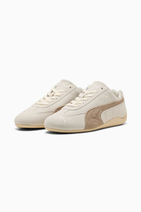 PRODUCT STORY The PUMA Speedcat has been a symbol of racing culture and street style for decades. The world first recognized it as an ultra-slim driving shoe designed to shave milliseconds off lap times. It later transformed into a sleek streetwear essential spotted in the fashion capitals around the globe. Its story continues to evolve as it's embraced by trendsetters and pace-setters of every generation. DETAILS - Style: 403619_01 - Color: Warm White-Ice Coffee - Width: Regular - Toe Type: Rounded - Fastener: Laces - Heel type: Flat - Lining: Mesh - OrthoLite® sockliner - Outsole: Rubber MATERIAL INFORMATION - Sockliner: 100% Textile - Outsole: 100% Rubber - Upper: 97.82% Leather - cow, 2.18% Textile - Lining: 55.14% Textile, 44.86% Synthetic
