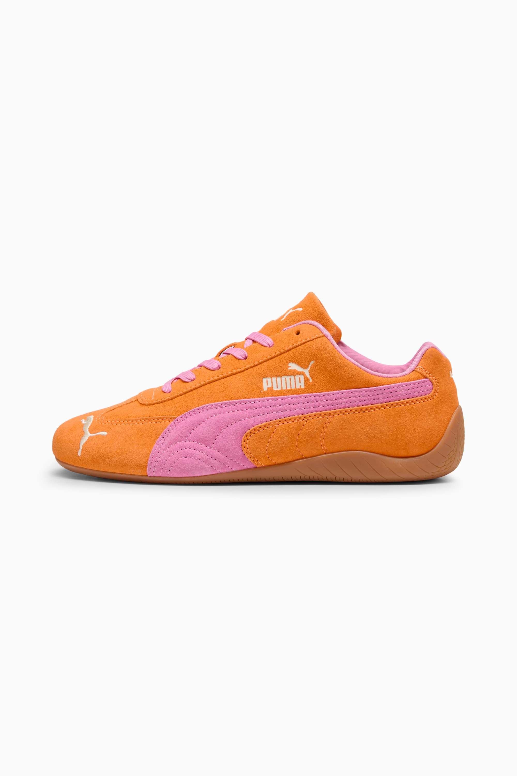 PRODUCT STORY An icon of racing culture, the PUMA Speedcat has been synonymous with speed, precision, and unparalleled performance for over 25 years. It originated as a fireproof Formula 1® footwear style, but over the decades it found itself on a new circuit – transcending the tracks of Monaco for the streets of global fashion capitals. Wrapped in soft suede and premium leather, this silhouette is reissued in its original red and black colorways with a new PUMA Cat Logo at the front. FEATURES & BENEFITS - IMEVA: PUMA's material for a lightweight and comfortable feel - PUMA's leather products support responsible manufacturing via the Leather Working Group. www.leatherworkinggroup.com DETAILS - Style: 400986_50 - Color: Orange Glo-Poised Pink - Leather upper - Rubber midsole - Rubber outsole - Suede PUMA Formstrip - PUMA Cat embroidered on the toe