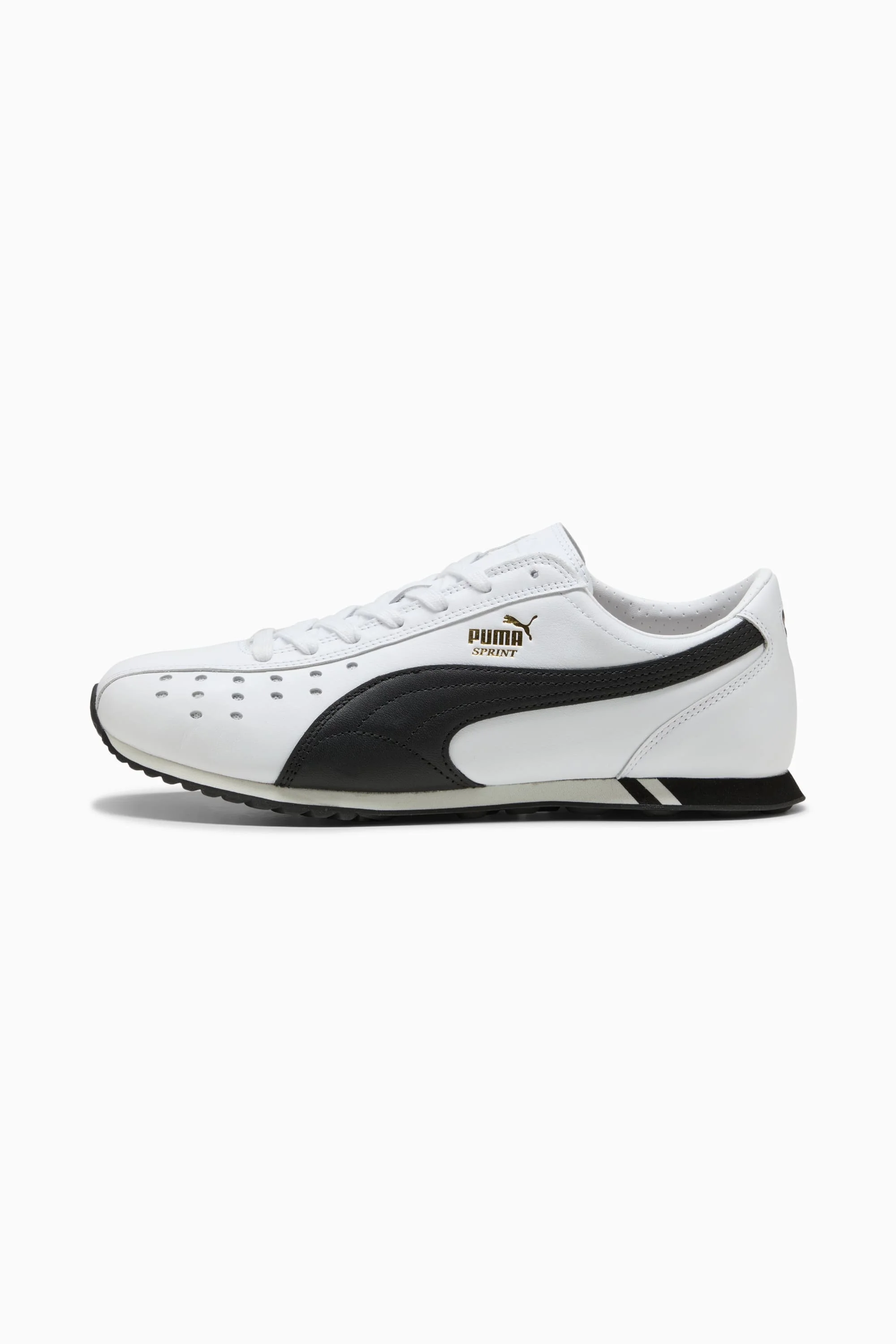PRODUCT STORY The PUMA Sprint was born in the 2000s as a running shoe and hasn't slowed down since. Today we're bringing this running icon out of the archives and into the streets. DETAILS - Style: 402960_01 - Color: PUMA White-PUMA Black - Width: Regular - Toe Type: Rounded - Fastener: Laces - Heel type: Flat - Moulded footbed MATERIAL INFORMATION - Midsole: 100% Synthetic - Sockliner: 100% Textile - Outsole: 100% Rubber - Upper: 98.22% Leather - cow, 1.78% Synthetic - Lining: 100% Synthetic