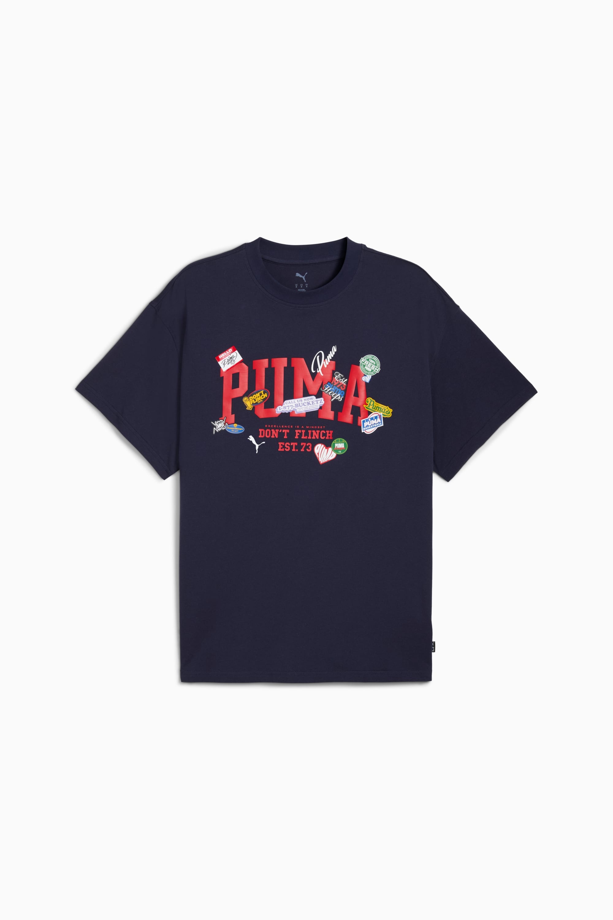 PRODUCT STORY Bring your A-game on and off the court with our basketball lifestyle pieces. Easy-to-wear essentials like hoodies, jerseys, tees, and sweatpants get a fresh update with bold graphics and details inspired by our love for the game. Whether it's warm-ups, post-game, or everyday wear, these pieces are designed to make a statement. FEATURES & BENEFITS - Made with at least 20% recycled cotton. DETAILS - Style: 632836_01 - Color: PUMA Navy - Fit: Oversized - Main material: Single jersey - Neck: Crew neck - Short sleeves - Length: Regular MATERIAL INFORMATION - Shell: 100% cotton - Rib: 70% cotton, 30% polyester