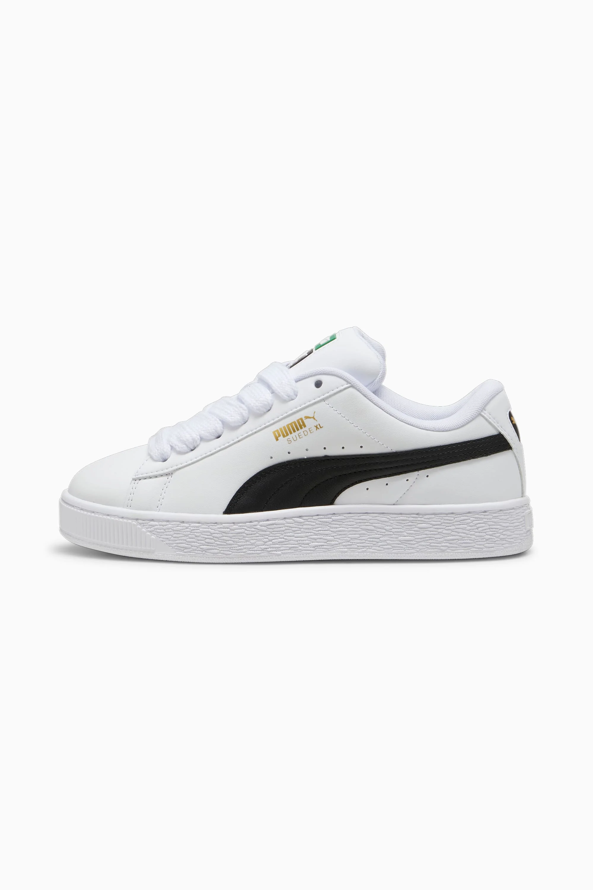 PRODUCT STORY This fresh take on the classic Suede draws inspiration from PUMA’s heritage within breakdancing and its influence on modern streetwear. The Suede XL retains the Suede’s iconic DNA, but gives it a twist with an exaggerated padded collar and tongue, plus a chunkier sole. This execution features a leather Formstrip and foil printed PUMA branding. FEATURES & BENEFITS - PUMA’s leather products support responsible manufacturing via the Leather Working Group.www.leatherworkinggroup.com DETAILS - Style: 397255_02 - Color: PUMA White-PUMA Black - Regular fit - Synthetic base - Mesh insole with multiple screen-printed PUMA logo - Synthetic eyelets, panel and heel reinforcement - Synthetic tongue with mesh trim - CPU insert with PUMA branding on the tongue - Mesh lining - Rubber midsole - Rubber outsole MATERIAL INFORMATION - Sockliner: 100% Textile - Outsole: 100% Rubber - Upper: 60.21% Leather - cow, 36.98% Synthetic, 2.81% Textile - Lining: 100% Textile