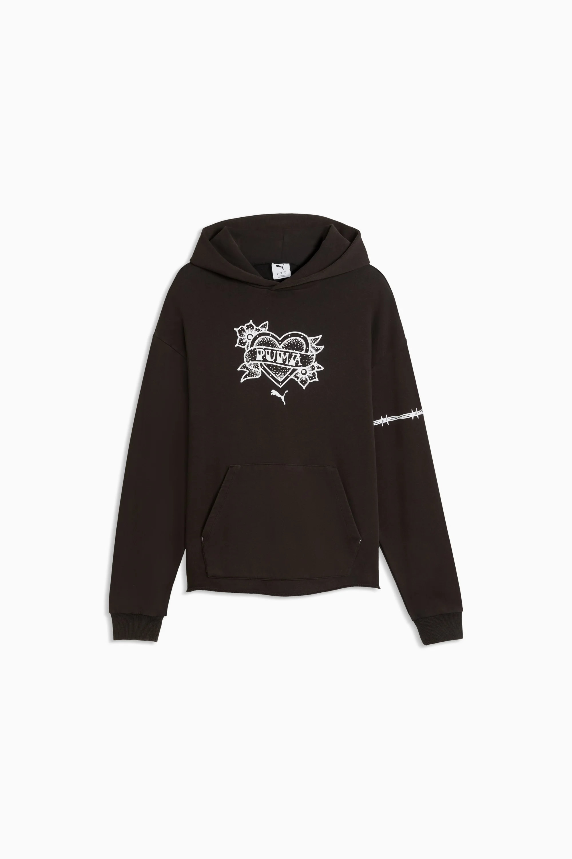 PRODUCT STORY Step into the world of Swish and Ink - a basketball collection that fuses bold, ink-inspired graphics with game-ready style. From roses and script to illustrated motifs, each piece is crafted for players who bring art and attitude to every move. FEATURES & BENEFITS - Made with at least 20% recycled cotton. DETAILS - Style: 634665_01 - Color: PUMA Black - Fit: Relaxed - Main material type: French terry - Hoodie - Long sleeves - Length: Regular MATERIAL INFORMATION - Hood Lining: 100% cotton - Hood: 100% cotton - Shell: 100% cotton - Rib: 97% cotton, 3% elastane