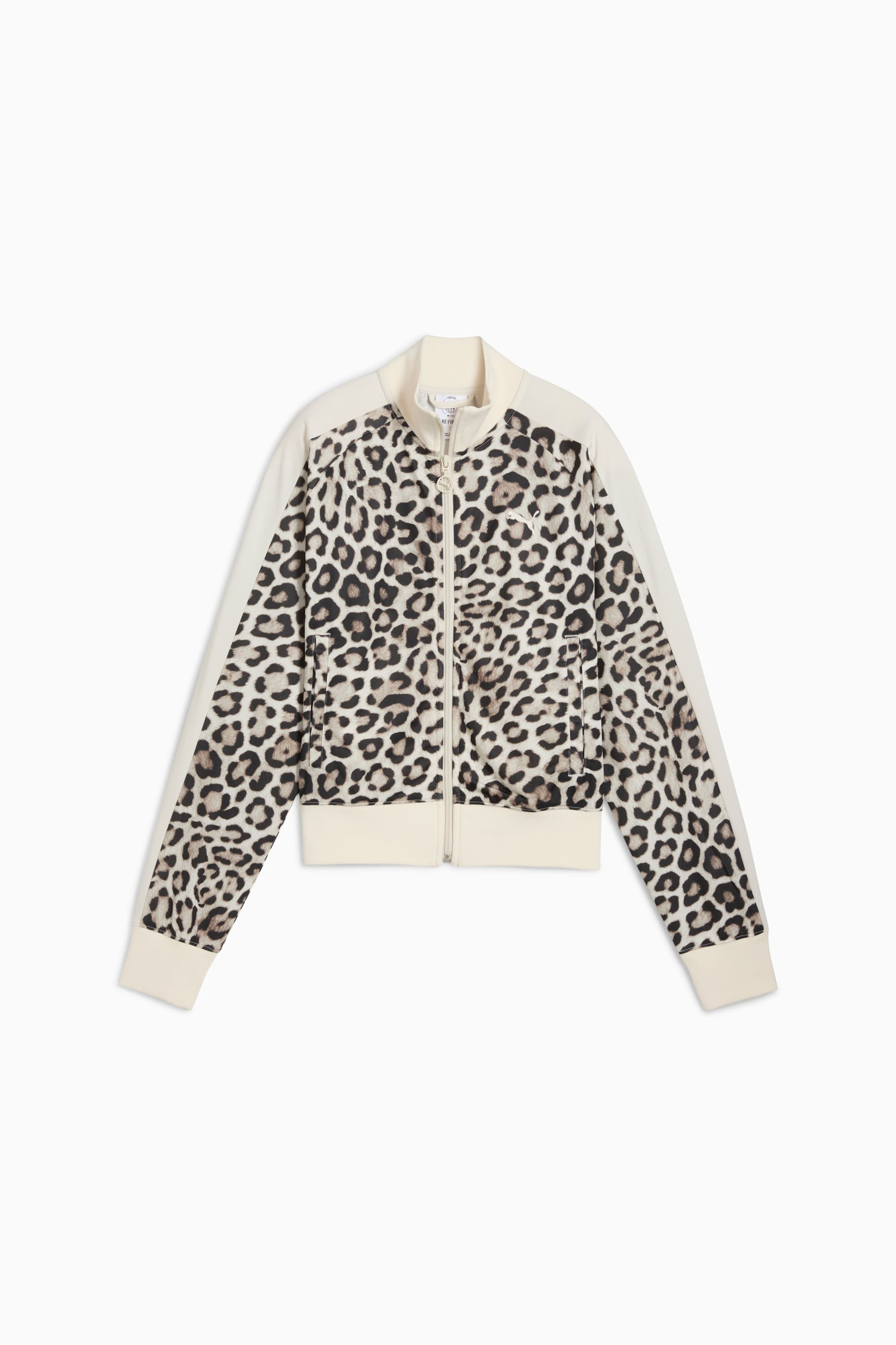 PRODUCT STORY Unleash your wild side with PUMA's track jacket, featuring an all-over leopard print, T7 panel inserts, and a two-way zipper. Ribbed hem and cuffs ensure a snug fit, while the embroidered PUMA Cat logo adds a touch of authenticity. DETAILS - Style: 632342_91 - Color: Alpine Snow-Ice Coffee - Regular fit - Tricot - Short jacket length - Stand up collar - Full zip - Long sleeves - PUMA branding details MATERIAL INFORMATION - Shell: 100% polyester - Rib: 97% polyester, 3% elastane
