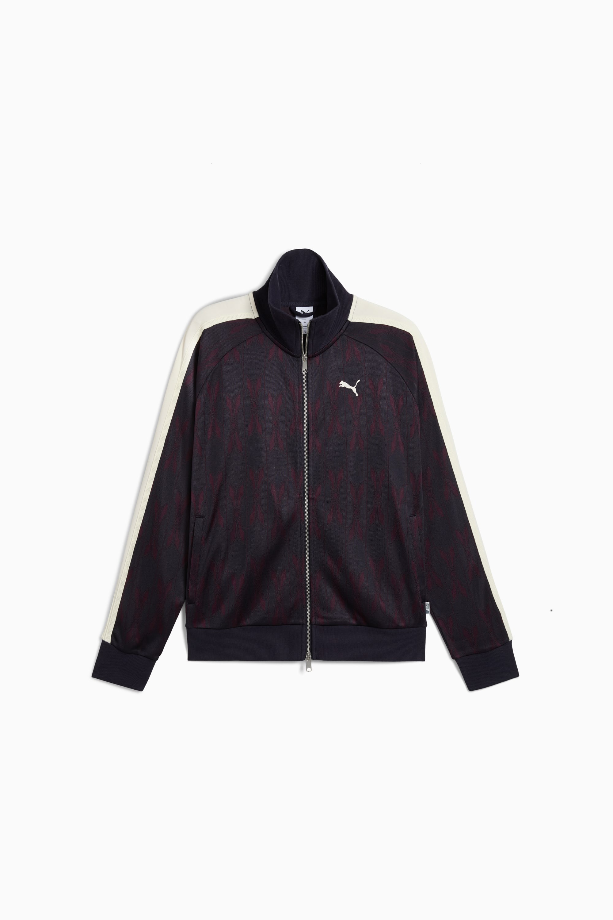 PRODUCT STORY A continuation of the smash hit "NeverWorn" collection, the NeverWorn V is a new iteration that aims to revolutionise our iconic T7 tracksuit. First created in 1967 and quickly becoming as popular on city streets as it was on training grounds, we're celebrating the T7's history with an all-over pattern pulled from the archives, vibrant colours, and an oversized feel. FEATURES & BENEFITS - Made with at least 50% recycled materials DETAILS - Style: 631491_16 - Color: New Navy - Relaxed fit - Double face jacquard fabric - Standard jacket length - Stand up, ribbed collar - 2-way metal full-zip closure - Long sleeves with ribbed cuffs and hem - Signature T7 stripes along the sleeves - Side zip pockets MATERIAL INFORMATION - Inserts: 59% polyester, 41% cotton - Shell: 100% polyester - Pocket Bag: 100% cotton - Rib: 96% cotton, 4% elastane
