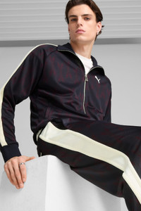PRODUCT STORY A continuation of the smash hit "NeverWorn" collection, the NeverWorn V is a new iteration that aims to revolutionise our iconic T7 tracksuit. First created in 1967 and quickly becoming as popular on city streets as it was on training grounds, we're celebrating the T7's history with an all-over pattern pulled from the archives, vibrant colours, and an oversized feel. FEATURES & BENEFITS - Made with at least 90% recycled materials DETAILS - Style: 631492_16 - Color: New Navy - Relaxed fit - Double face jacquard fabric - Regular length - Pintuck details - Elasticated waistband with internal drawcords - Signature T7 stripes along the legs - Zip pocket at the back and side zip pockets MATERIAL INFORMATION - Inserts: 59% polyester, 41% cotton - Upper Pocket Bag: 100% cotton - Shell: 100% polyester - Lower Pocket Bag: 100% polyester - BACK POCKET BAG: 100% cotton - Pocket Bag: 100% cotton