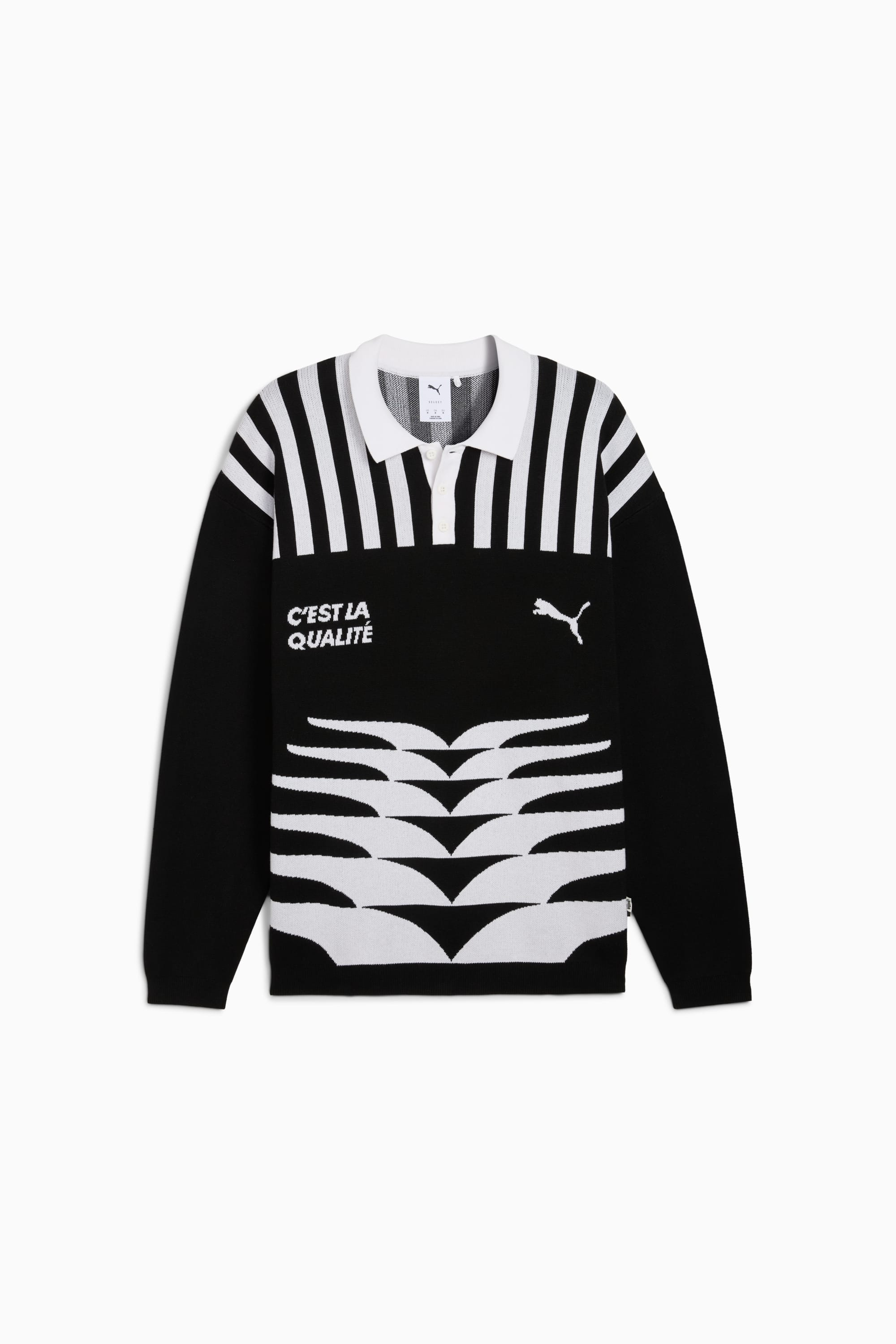 PRODUCT STORY A continuation of the smash-hit "NeverWorn" collection, The NeverWorn VI takes PUMA's history and remixes it for the modern world. This collection is a celebration of our archive and a return to a retro soccer aesthetic with relaxed fits, knits, and new all-over patterns. FEATURES & BENEFITS - Made with at least 30% recycled materials DETAILS - Style: 632512_01 - Color: PUMA Black - Relaxed fit - Collar neck - Long sleeves - Button placket with collar - Regular length - Ribbed cuffs and hem MATERIAL INFORMATION - Shell: 60% cotton, 40% polyester - Collar: 50% cotton, 33% polyester, 17% nylon - Top Waistband: 55% cotton, 37% polyester, 6% nylon, 2% elastane - Sleeve Cuff: 55% cotton, 37% polyester, 6% nylon, 2% elastane