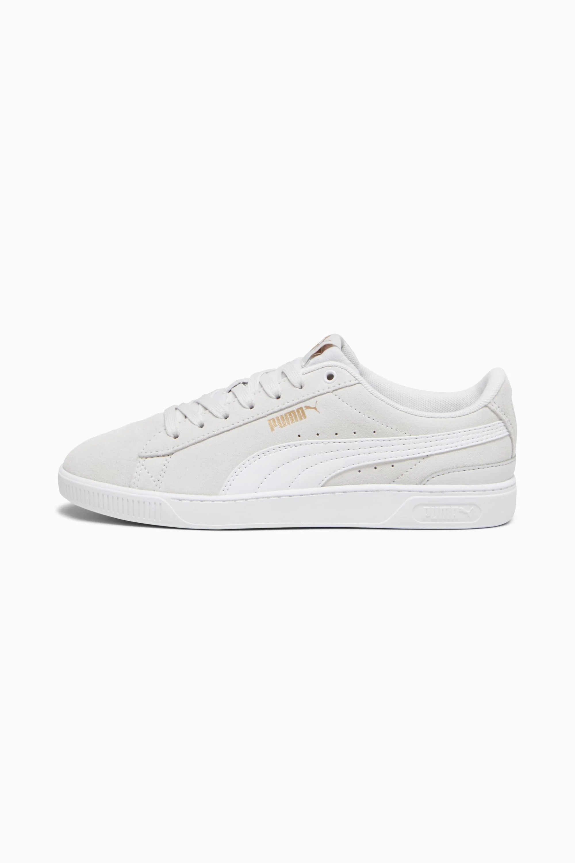 Sleek, smooth and understated, on-point design are the hallmarks of the Vikky. We've revamped this familiar silhouette with modern tooling on the cupsole, while retaining the minimalist lines and classic branding of previous models. Our SoftFoam+ sockliner adds optimal cushioning to make these an absolutely unbeatable everyday shoe. FEATURES & BENEFITS - SoftFoam+: PUMA's comfort sockliner for instant step-in and long-lasting comfort that provides soft cushioning every step of your day DETAILS - Style: 383023_15 - Color: Feather Gray-PUMA White-PUMA Gold - Low boot - Suede upper - SoftFoam+ sockliner - Rubber cupsole - Lace closure - PUMA Formstrip at lateral side - Label with PUMA No. 1 Logo at tongue - PUMA No. 2 Logo at lateral side