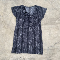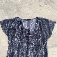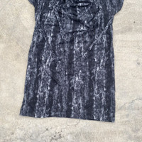 Tornado Mart short sleeve cowl neck top in a distressed black/grey pattern with a textured, almost tie-dye effect. Lightweight and fitted silhouette with an edgy, draped neckline—classic of the Japanese label’s signature avant-garde streetwear style. • Tagged size: S • Pit to pit: 18” • Length: 31” • Shoulder: 15” • Sleeve length: 4” • Condition: 9/10 – Excellent condition, minimal signs of wear • Color: Washed black / grey distressed pattern Perfect layering piece for a grunge, streetwear, or J-fashion inspired fit. Rare and bold—stand out with this signature Tornado Mart design.
