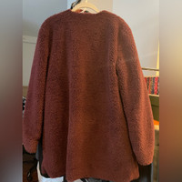 super warm and cozy! Faux fur texture in burgundy color Collarless, hidden hook eye closure at the center front