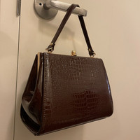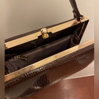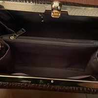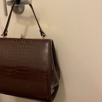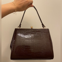 In surprisingly good condition! Never use it myself after I purchased it from a vintage store. Looks super retro! I don’t have anything that goes with this bag so hoping someone else can make better use of it! Glossy crocodile leather effect in brownish color - don’t think it’s real leather though Gold tone hardware, the lining on the interior is kind of thin but does the job