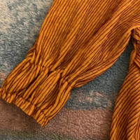 Golden yellow + brownish texture Smocked effect Ruched at the waist Slightly puff sleeve - shoulder looks flattering