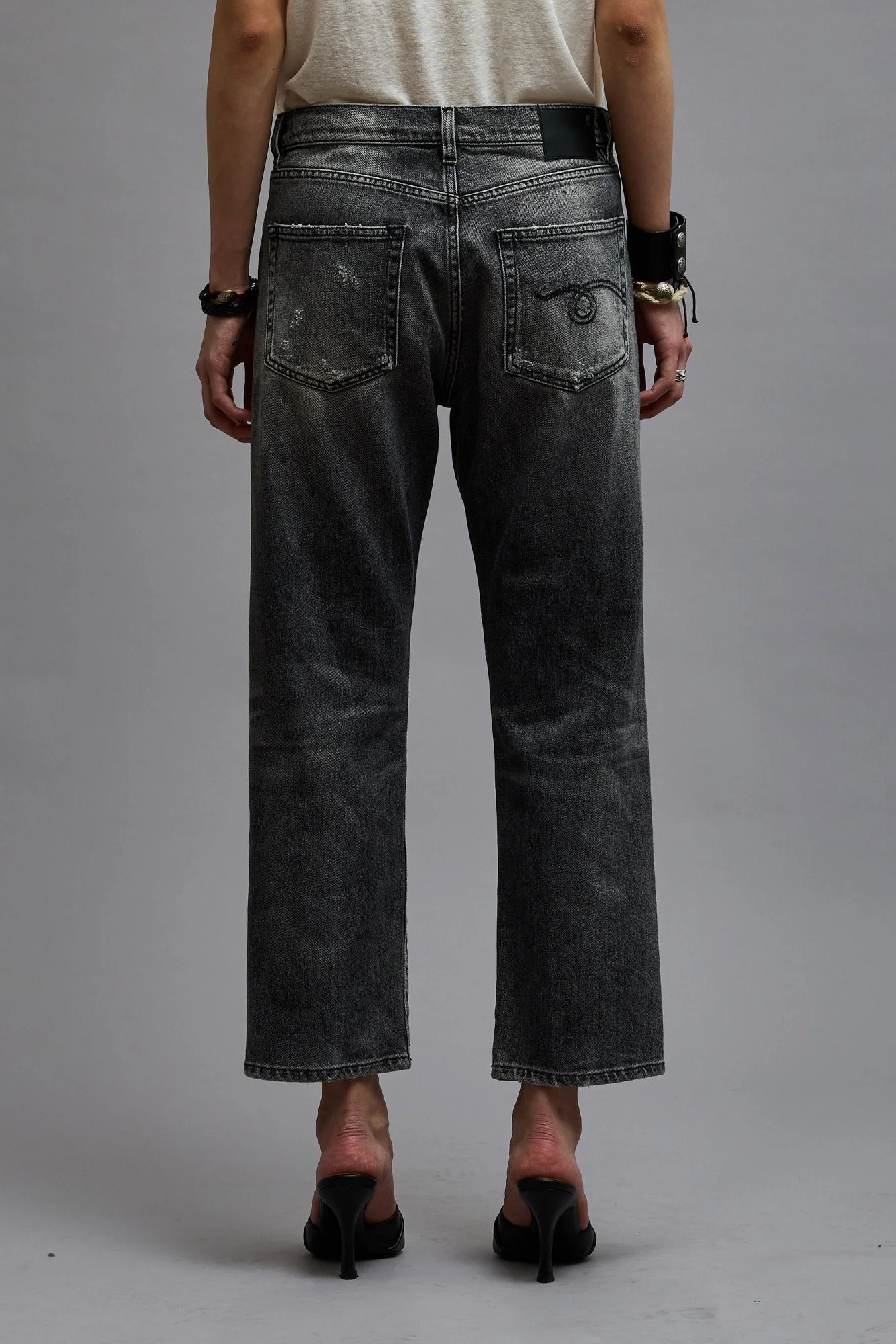 Classic Boyfriend jean made with comfort stretch black denim. Features a heavily worn grey wash, black on ecru stretch denim and a low density weave for an extra soft feel.This style runs slightly large. If in between sizes, we recommend sizing down. - MADE IN ITALY - Color: Vintage Grey - Sasha is 5’10” and wearing size 27 - Bust 32”; Waist 23”; Hips 35” - 92% Cotton, 8% Lycra T400 - R13W5083-D137C