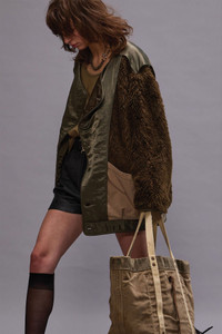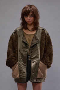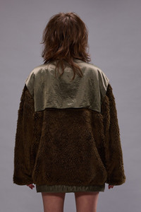 Military style cocoon liner featuring asymmetric button closure, oversized pleated pockets and faux fur arms. - Made in the USA - Color: Olive/Khaki - 100% PC - R13WR364-R470A - Imported