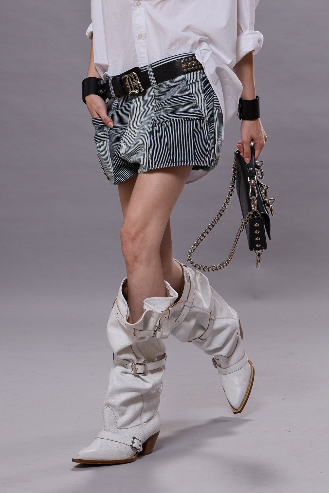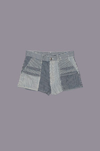 Made with a Japanese railroad stripe denim pattern 5.5 oz fabric blocked into different panels. DETAILS Color: Multi Stripe Railroad 100% Cotton R13WD157-D212A Imported