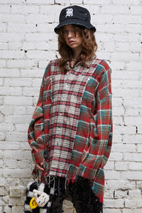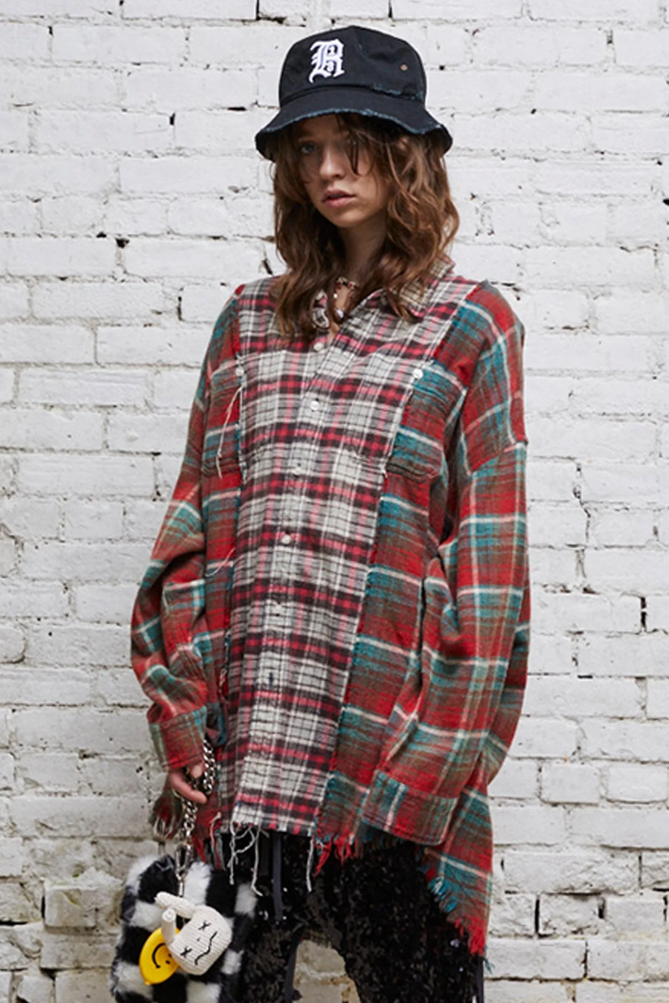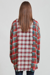 Two different oversized plaid shirts pieced together for a deconstructed look. Made from Japanese plaid and treated with a softening enzyme wash. - Color: Grey Plaid w/ Blue and Red Plaid - Model is 5'10 and wearing size M - Bust 34”; waist 24”; hips 35” - 100% Cotton - R13WR012-R129B