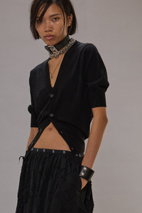 Wool cashmere blend elbow sleeve cardigan with a tapered hem for a cinched dramatic opening.